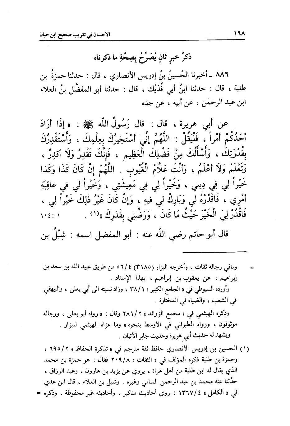 886 - أَخْبَرَنَا الْحُسَيْنُ بْنُ إِدْرِيسَ الْأَنْصَارِيُّ، قَالَ: حَدَّثَنَا حَمْزَةُ بْنُ طِلْبَةَ، قَالَ: حَدَّثَنَا ابْنُ أَبِي فُدَيْكٍ، قَالَ: حَدَّثَنَا أَبُو الْمُفَضَّلِ بْنُ الْعَلَاءِ بْنِ عَبْدِ الرَّحْمَنِ، عَنْ أَبِيهِ، عَنْ جَدِّهِ، عَنْ أَبِي هُرَيْرَةَ، قَالَ: قَالَ رَسُولُ اللَّهِ صَلَّى اللَّهُ عَلَيْهِ وَسَلَّمَ: «إِذَا أَرَادَ أَحَدُكُمْ أَمْرًا فَلْيَقُلِ: اللَّهُمَّ إِنِّي أَسْتَخِيرُكَ بِعِلْمِكَ، وَأَسْتَقْدِرُكَ بِقُدْرَتِكَ، وَأَسْأَلُكَ مِنْ فَضْلِكَ الْعَظِيمِ، فَإِنَّكَ تَقْدِرُ وَلَا أَقْدِرُ، وَتَعْلَمُ وَلَا أَعْلَمُ، وَأَنْتَ عَلَّامُ الْغُيُوبِ، اللَّهُمَّ إِنْ كَانَ كَذَا وَكَذَا خَيْرًا لِي فِي دِينِي، وَخَيْرًا لِي فِي مَعِيشَتِي، وَخَيْرًا لِي فِي عَاقِبَةِ أَمْرِي، فَاقْدُرْهُ لِي وَبَارِكْ لِي فِيهِ، وَإِنْ كَانَ غَيْرُ ذَلِكَ خَيْرًا لِي، فَاقْدُرْ لِيَ الْخَيْرَ حَيْثُ مَا كَانَ، وَرَضِّنِي بِقَدَرِكَ» (¬1) . [1: 104]