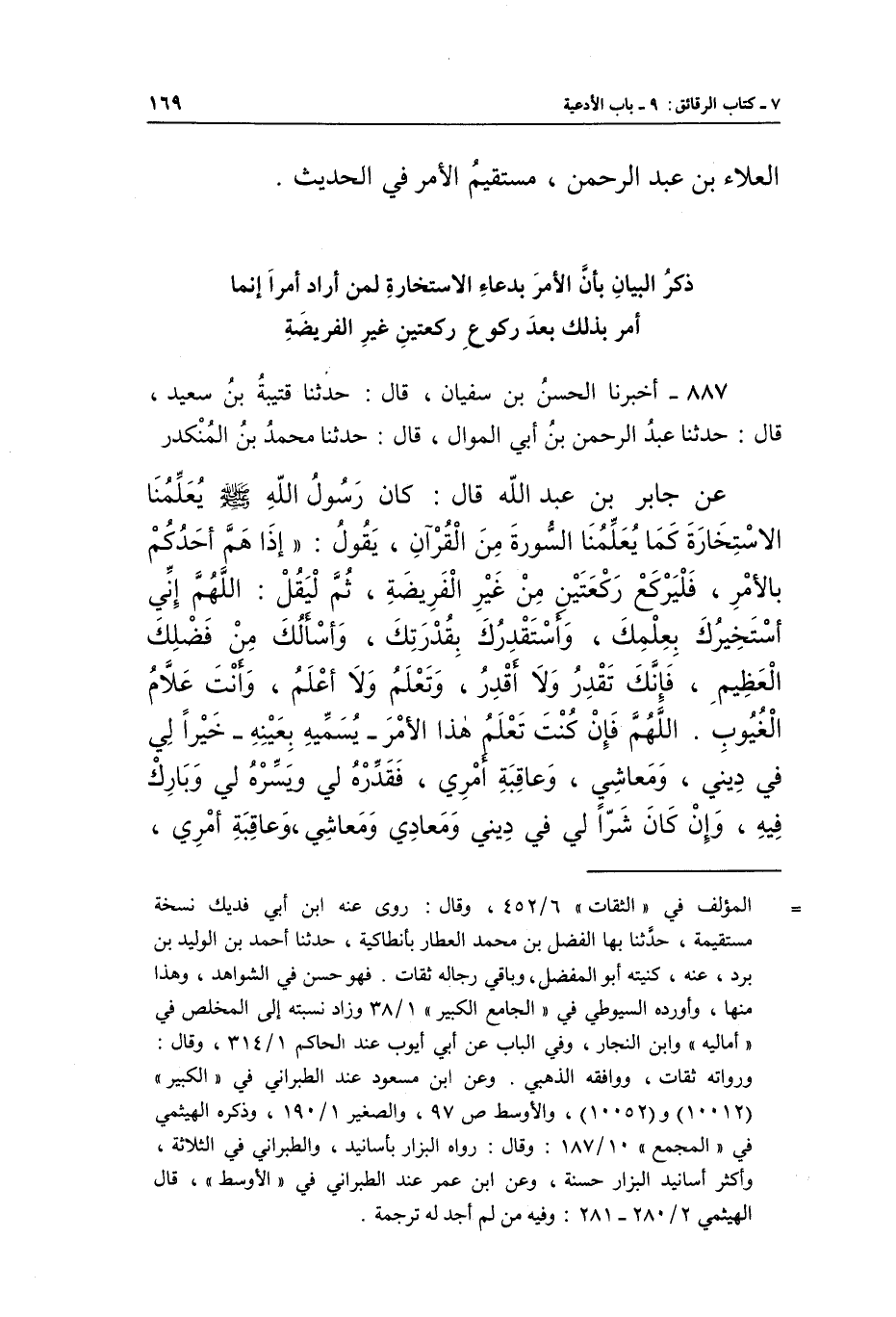 887 - أَخْبَرَنَا الْحَسَنُ بْنُ سُفْيَانَ، قَالَ: حَدَّثَنَا قُتَيْبَةُ بْنُ سَعِيدٍ، قَالَ: حَدَّثَنَا عَبْدُ الرَّحْمَنِ بْنُ أَبِي الْمَوَالِ، قَالَ: حَدَّثَنَا مُحَمَّدُ بْنُ الْمُنْكَدِرِ، عَنْ جَابِرِ بْنِ عَبْدِ اللَّهِ، قَالَ: كَانَ رَسُولُ اللَّهِ صَلَّى يُعَلِّمُنَا الِاسْتِخَارَةَ كَمَا يُعَلِّمُنَا السُّورَةَ مِنَ الْقُرْآنِ، يَقُولُ: «إِذَا هَمَّ أَحَدُكُمْ بِالْأَمْرِ، فَلْيَرْكَعْ رَكْعَتَيْنِ مِنْ غَيْرِ الْفَرِيضَةِ، ثُمَّ لِيَقُلِ: اللَّهُمَّ إِنِّي أَسْتَخِيرُكَ بِعِلْمِكَ، وَأَسْتَقْدِرُكَ بِقُدْرَتِكَ، وَأَسْأَلُكَ مِنْ فَضْلِكَ الْعَظِيمِ، فَإِنَّكَ تَقْدِرُ وَلَا أَقْدِرُ، وَتَعْلَمُ وَلَا أَعْلَمُ، وَأَنْتَ عَلَّامُ الْغُيُوبِ، اللَّهُمَّ فَإِنْ كُنْتَ تَعْلَمُ هَذَا الْأَمْرَ يُسَمِّيهِ بِعَيْنِهِ خَيْرًا لِي فِي دِينِي، وَمَعَاشِي، وَعَاقِبَةِ أَمْرِي, فقدره لي ويسره لي وبارك فيه وإن كان شرا لي في ديني ومعادي ومعاشي وعاقبة أمري