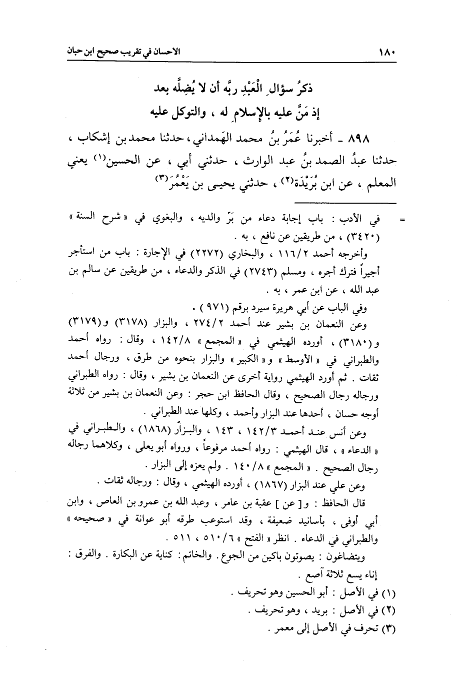 898 - أَخْبَرَنَا عُمَرُ بْنُ مُحَمَّدٍ الْهَمْدَانِيُّ، حَدَّثَنَا مُحَمَّدُ بْنُ إِشْكَابٍ، حَدَّثَنَا عَبْدُ الصَّمَدِ بْنُ عَبْدِ الْوَارِثِ، حَدَّثَنِي أَبِي، عَنِ الْحُسَيْنِ (¬1) يَعْنِي الْمُعَلِّمَ، عَنِ ابْنِ بُرَيْدَةَ (¬2) ، حَدَّثَنِي يَحْيَى بْنُ يَعْمُرَ (¬3) ،