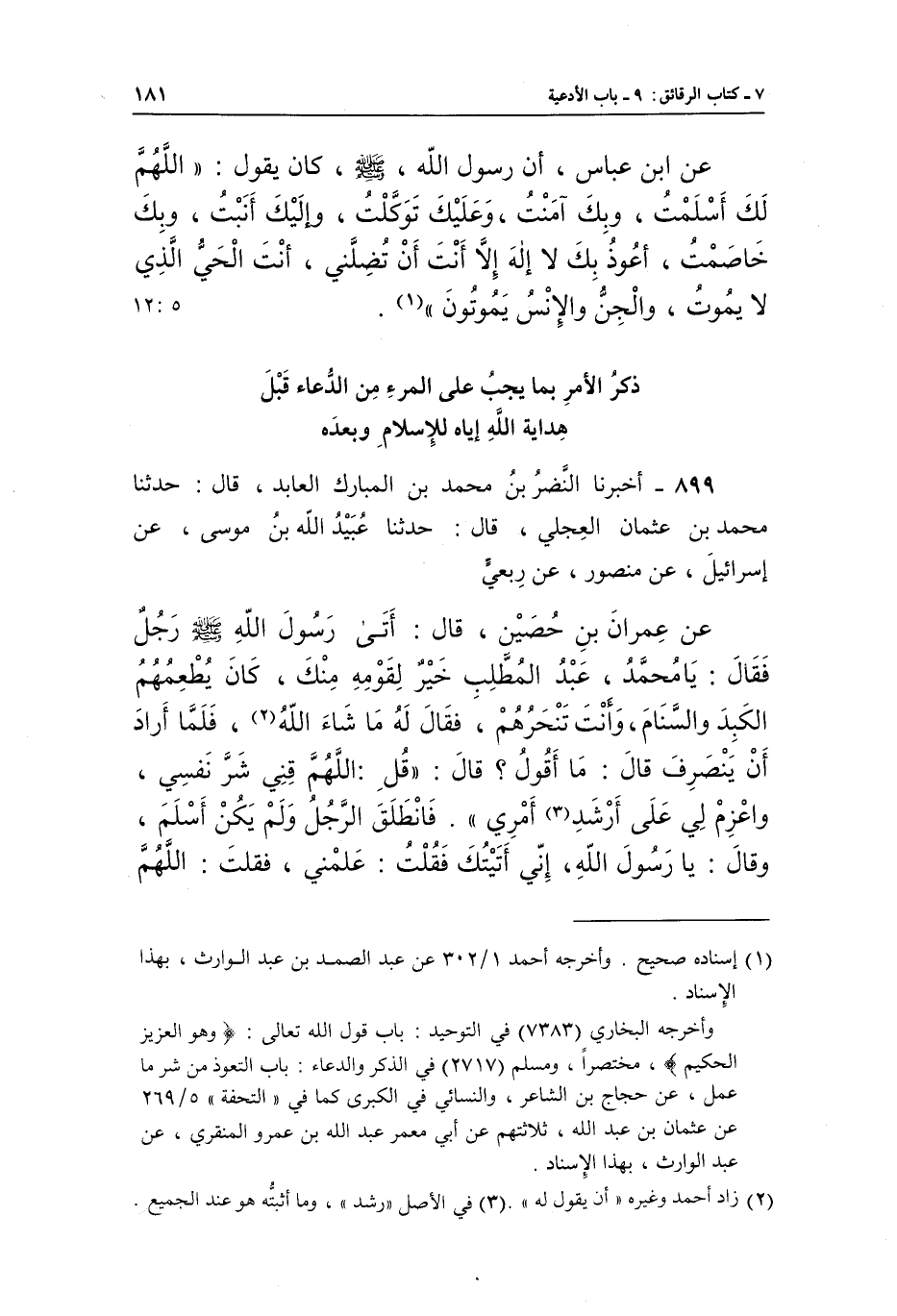 899 - أَخْبَرَنَا النَّضْرُ بْنُ مُحَمَّدِ بْنِ الْمُبَارَكِ الْعَابِدُ، قَالَ: حَدَّثَنَا مُحَمَّدُ بْنُ عُثْمَانَ الْعِجْلِيُّ، قَالَ: حَدَّثَنَا عُبَيْدُ اللَّهِ بْنُ مُوسَى، عَنْ إِسْرَائِيلَ، عَنْ مَنْصُورٍ، عَنْ رِبْعِيٍّ، عَنْ عِمْرَانَ بْنِ حُصَيْنٍ، قَالَ: أَتَى رَسُولَ اللَّهِ صَلَّى اللَّهُ عَلَيْهِ وَسَلَّمَ رَجُلٌ، فَقَالَ: يَا مُحَمَّدُ عَبْدُ الْمُطَّلِبِ خَيْرٌ لِقَوْمِهِ مِنْكَ، كَانَ يُطْعِمُهُمُ الْكَبِدَ وَالسَّنَامَ، وَأَنْتَ تَنْحَرُهُمْ، فَقَالَ لَهُ: مَا شَاءَ اللَّهُ (¬2) ، فَلَمَّا أَرَادَ أَنْ يَنْصَرِفَ، قَالَ: مَا أَقُولُ؟، قَالَ: «قُلِ: اللَّهُمَّ قِنِي شَرَّ نَفْسِي، وَاعْزِمْ لِي عَلَى أَرْشَدِ (¬3) أَمْرِي» فَانْطَلَقَ الرَّجُلُ وَلَمْ يَكُنْ أَسْلَمَ وَقَالَ: يَا رَسُولَ اللَّهِ، إِنِّي أَتَيْتُكَ فَقُلْتُ: عَلِّمْنِي، فَقُلْتَ: «اللَّهُمَّ