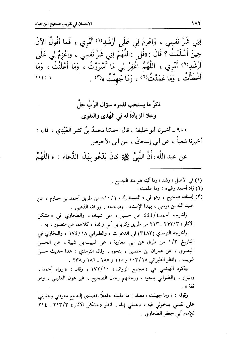 قِنِي شَرَّ نَفْسِي، وَاعْزِمْ لِي عَلَى أَرْشَدِ (¬1) أَمْرِي، فَمَا أَقُولُ الْآنَ حِينَ أَسْلَمْتُ؟، قَالَ: «قُلِ: اللَّهُمَّ قِنِي شَرَّ نَفْسِي، وَاعْزِمْ لِي عَلَى أَرْشَدِ (¬2) أَمْرِي، اللَّهُمَّ اغْفِرْ لِي مَا أَسْرَرْتُ، وَمَا أَعْلَنْتُ، وَمَا أَخْطَأْتُ، وَمَا عَمَدْتُ (2) ، وَمَا جَهِلْتُ» (¬3) . [1: 104]