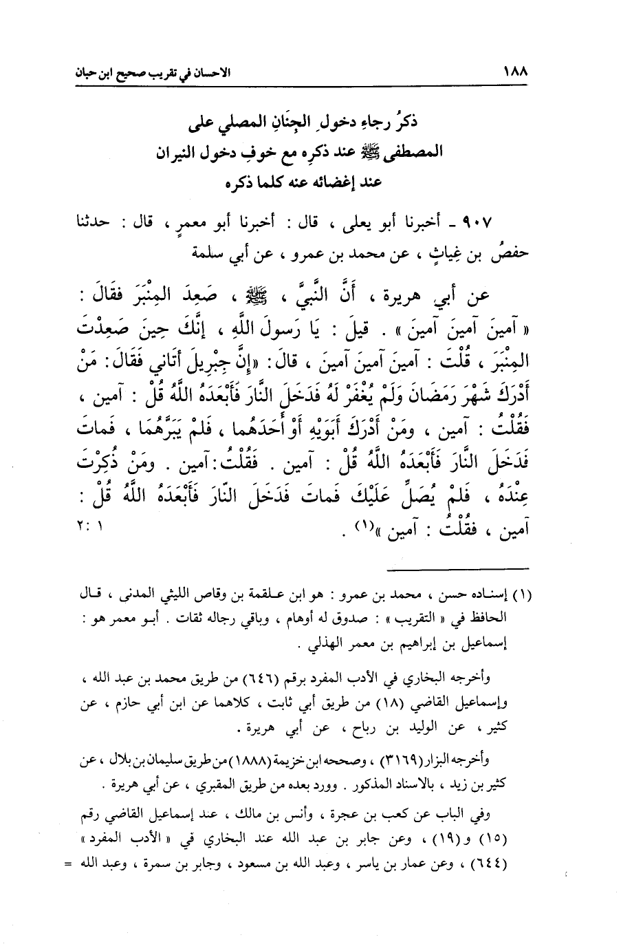 907 - أَخْبَرَنَا أَبُو يَعْلَى، قَالَ: أَخْبَرَنَا أَبُو مَعْمَرٍ، قَالَ: حَدَّثَنَا حَفْصُ بْنُ غِيَاثٍ، عَنْ مُحَمَّدِ بْنِ عَمْرٍو، عَنْ أَبِي سَلَمَةَ، عَنْ أَبِي هُرَيْرَةَ، أَنَّ النَّبِيَّ صَلَّى اللَّهُ عَلَيْهِ وَسَلَّمَ صَعِدَ الْمِنْبَرَ، فَقَالَ: «آمِينَ آمِينَ آمِينَ» قِيلَ: يَا رَسُولَ اللَّهِ، إِنَّكَ حِينَ صَعِدْتَ الْمِنْبَرَ قُلْتَ: آمِينَ آمِينَ آمِينَ، قَالَ: «إِنَّ جِبْرِيلَ أَتَانِي، فَقَالَ: مَنْ أَدْرَكَ شَهْرَ رَمَضَانَ وَلَمْ يُغْفَرْ لَهُ فَدَخَلَ النَّارَ فَأَبْعَدَهُ اللَّهُ، قُلْ: آمِينَ، فَقُلْتُ: آمِينَ، وَمَنْ أَدْرَكَ أَبَوَيْهِ أَوْ أَحَدَهُمَا فَلَمْ يَبَرَّهُمَا، فَمَاتَ فَدَخَلَ النَّارَ فَأَبْعَدَهُ اللَّهُ، قُلْ: آمِينَ، فَقُلْتُ: آمِينَ، وَمَنْ ذُكِرْتُ عِنْدَهُ فَلَمْ يُصَلِّ عَلَيْكَ فَمَاتَ فَدَخَلَ النَّارَ فَأَبْعَدَهُ اللَّهُ، قُلْ: آمِينَ، فَقُلْتُ: آمِينَ» (¬1) . [1: 2]