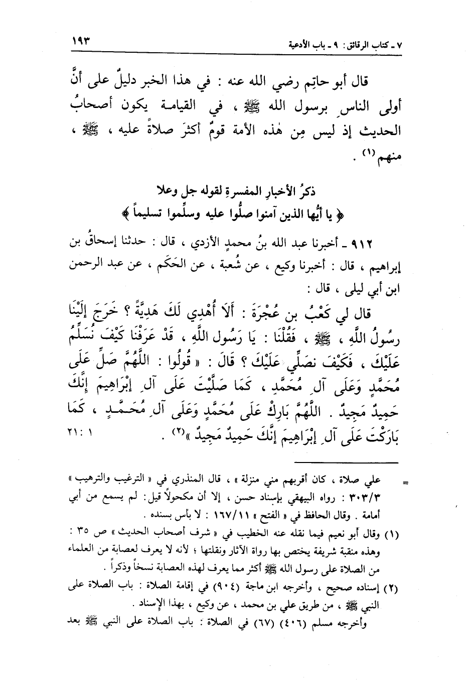 912 - أَخْبَرَنَا عَبْدُ اللَّهِ بْنُ مُحَمَّدٍ الْأَزْدِيُّ، قَالَ: حَدَّثَنَا إِسْحَاقُ بْنُ إِبْرَاهِيمَ، قَالَ: أَخْبَرَنَا وَكِيعٌ، عَنْ شُعْبَةَ، عَنِ الْحَكَمِ، عَنْ عَبْدِ الرَّحْمَنِ بْنِ أَبِي لَيْلَى، قَالَ: قَالَ لِي كَعْبُ بْنُ عُجْرَةَ: أَلَا أُهْدِي لَكَ هَدِيَّةً؟ خَرَجَ إِلَيْنَا رَسُولُ اللَّهِ صَلَّى اللَّهُ عَلَيْهِ وَسَلَّمَ، فَقُلْنَا: يَا رَسُولَ اللَّهِ، قَدْ عَرَفْنَا كَيْفَ نُسَلِّمُ عَلَيْكَ، فَكَيْفَ نُصَلِّي عَلَيْكَ؟، قَالَ: «قُولُوا: اللَّهُمَّ صَلِّ عَلَى مُحَمَّدٍ وَعَلَى آلِ مُحَمَّدٍ، كَمَا صَلَّيْتَ عَلَى آلِ إِبْرَاهِيمَ إِنَّكَ حَمِيدٌ مَجِيدٌ؛ اللَّهُمَّ بَارِكْ عَلَى مُحَمَّدٍ وَعَلَى آلِ مُحَمَّدٍ، كَمَا بَارَكْتَ عَلَى آلِ إِبْرَاهِيمَ إِنَّكَ حَمِيدٌ مَجِيدٌ» (¬2) . [1: 12]