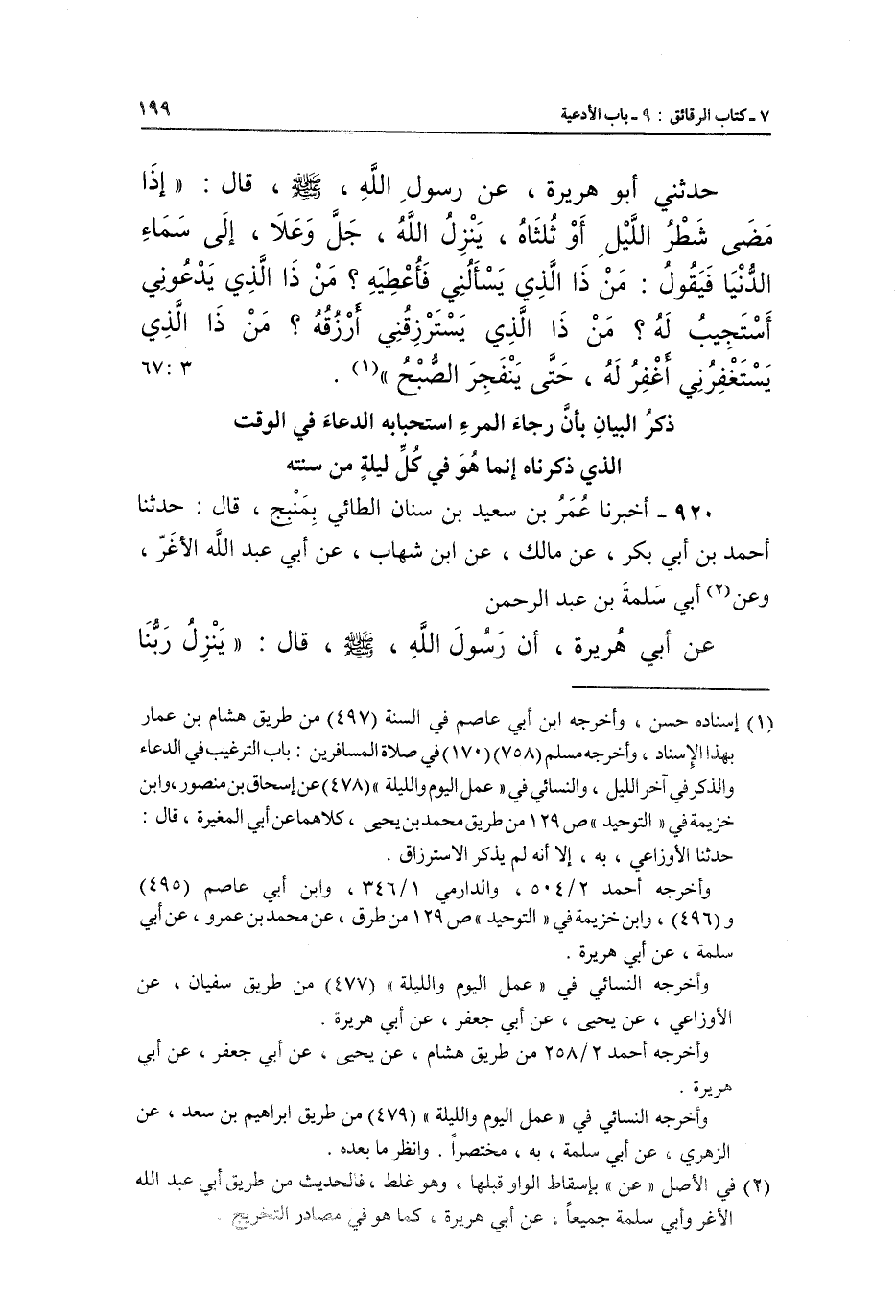 920 - أَخْبَرَنَا عُمَرُ بْنُ سَعِيدِ بْنِ سِنَانٍ الطَّائِيُّ بِمَنْبَجَ، قَالَ: حَدَّثَنَا أَحْمَدُ بْنُ أَبِي بَكْرٍ، عَنْ مَالِكٍ، عَنِ ابْنِ شِهَابٍ، عَنْ أَبِي عَبْدِ اللَّهِ الْأَغَرِّ، وَعَنْ (¬2) أَبِي سَلَمَةَ بْنِ عَبْدِ الرَّحْمَنِ، عَنْ أَبِي هُرَيْرَةَ، أَنَّ رَسُولَ اللَّهِ صَلَّى اللَّهُ عَلَيْهِ وَسَلَّمَ، قَالَ: «يَنْزِلُ رَبُّنَا