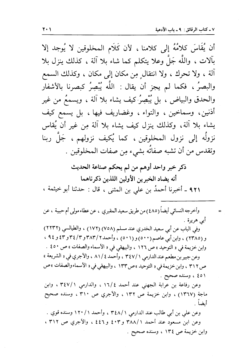 أَنْ يُقَاسَ كَلَامُهُ إِلَى كَلَامِنَا، لِأَنَّ كَلَامَ الْمَخْلُوقِينَ لَا يُوجَدُ إِلَّا بِآلَاتٍ، وَاللَّهُ جَلَّ وَعَلَا يَتَكَلَّمُ كَمَا شَاءَ بِلَا آلَةٍ، كَذَلِكَ يَنْزِلُ بِلَا آلَةٍ، وَلَا تَحَرُّكٍ، وَلَا انْتِقَالٍ مِنْ مَكَانٍ إِلَى مَكَانٍ، وَكَذَلِكَ السَّمْعُ وَالْبَصَرُ، فَكَمَا لَمْ يَجُزْ أَنْ يُقَالَ: اللَّهُ يُبْصِرُ كَبَصَرِنَا بِالْأَشْفَارِ وَالْحَدَقِ وَالْبَيَاضِ، بَلْ يُبْصِرُ كَيْفَ يَشَاءُ بِلَا آلَةٍ، وَيَسْمَعُ مِنْ غَيْرِ أُذُنَيْنِ، وَسِمَاخَيْنِ، وَالْتِوَاءٍ، وَغَضَارِيفَ فِيهَا، بَلْ يَسْمَعُ كَيْفَ يَشَاءُ بِلَا آلَةٍ، وَكَذَلِكَ يَنْزِلُ كَيْفَ يَشَاءُ بِلَا آلَةٍ مِنْ غَيْرِ أَنْ يُقَاسَ نُزُولُهُ إِلَى نُزُولِ الْمَخْلُوقِينَ، كَمَا يُكَيَّفُ نُزُولُهُمْ، جَلَّ رَبُّنَا وَتَقَدَّسَ مِنْ أَنْ تُشَبَّهَ صِفَاتُهُ بِشَيْءٍ مِنْ صِفَاتِ الْمَخْلُوقِينَ.