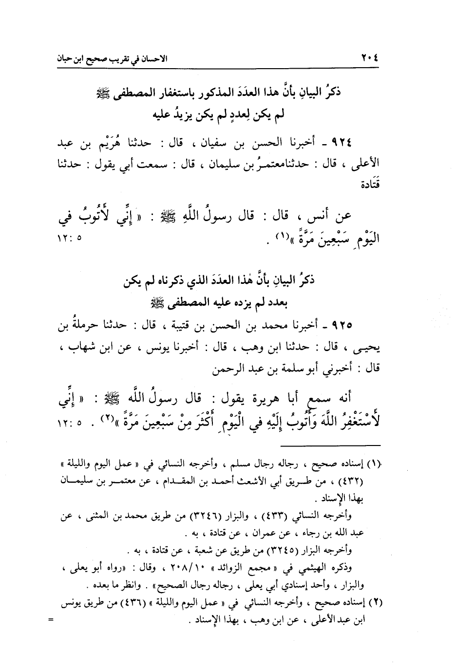 925 - أَخْبَرَنَا مُحَمَّدُ بْنُ الْحَسَنِ بْنِ قُتَيْبَةَ، قَالَ: حَدَّثَنَا حَرْمَلَةُ بْنُ يَحْيَى، قَالَ: حَدَّثَنَا ابْنُ وَهْبٍ، قَالَ: أَخْبَرَنَا يُونُسُ، عَنِ ابْنِ شِهَابٍ، قَالَ: أَخْبَرَنِي أَبُو سَلَمَةَ بْنُ عَبْدِ الرَّحْمَنِ، أَنَّهُ سَمِعَ أَبَا هُرَيْرَةَ، يَقُولُ: قَالَ رَسُولُ اللَّهِ صَلَّى اللَّهُ عَلَيْهِ وَسَلَّمَ: «إِنِّي لَأَسْتَغْفِرُ اللَّهَ وَأَتُوبُ إِلَيْهِ فِي الْيَوْمِ أَكْثَرَ مِنْ سَبْعِينَ مَرَّةً» (¬2) . [5: 12]