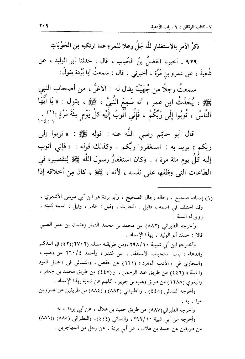 929 - أَخْبَرَنَا الْفَضْلُ بْنُ الْحُبَابِ، قَالَ: حَدَّثَنَا أَبُو الْوَلِيدِ، عَنْ شُعْبَةَ، عَنْ عَمْرِو بْنِ مُرَّةَ، أَخْبَرَنِي، قَالَ: سَمِعْتُ أَبَا بُرْدَةَ يَقُولُ: سَمِعْتُ رَجُلًا مِنْ جُهَيْنَةَ يُقَالُ لَهُ: الْأَغَرُّ، مِنْ أَصْحَابِ النَّبِيِّ صَلَّى اللَّهُ عَلَيْهِ وَسَلَّمَ، يُحَدِّثُ ابْنَ عُمَرَ، أَنَّهُ سَمِعَ النَّبِيَّ صَلَّى اللَّهُ عَلَيْهِ وَسَلَّمَ، يَقُولُ: «يَا أَيُّهَا النَّاسُ، تُوبُوا إِلَى رَبِّكُمْ، فَإِنِّي أَتُوبُ إِلَيْهِ كُلَّ يَوْمٍ مِائَةَ مَرَّةٍ» (¬1) . [1: 104]