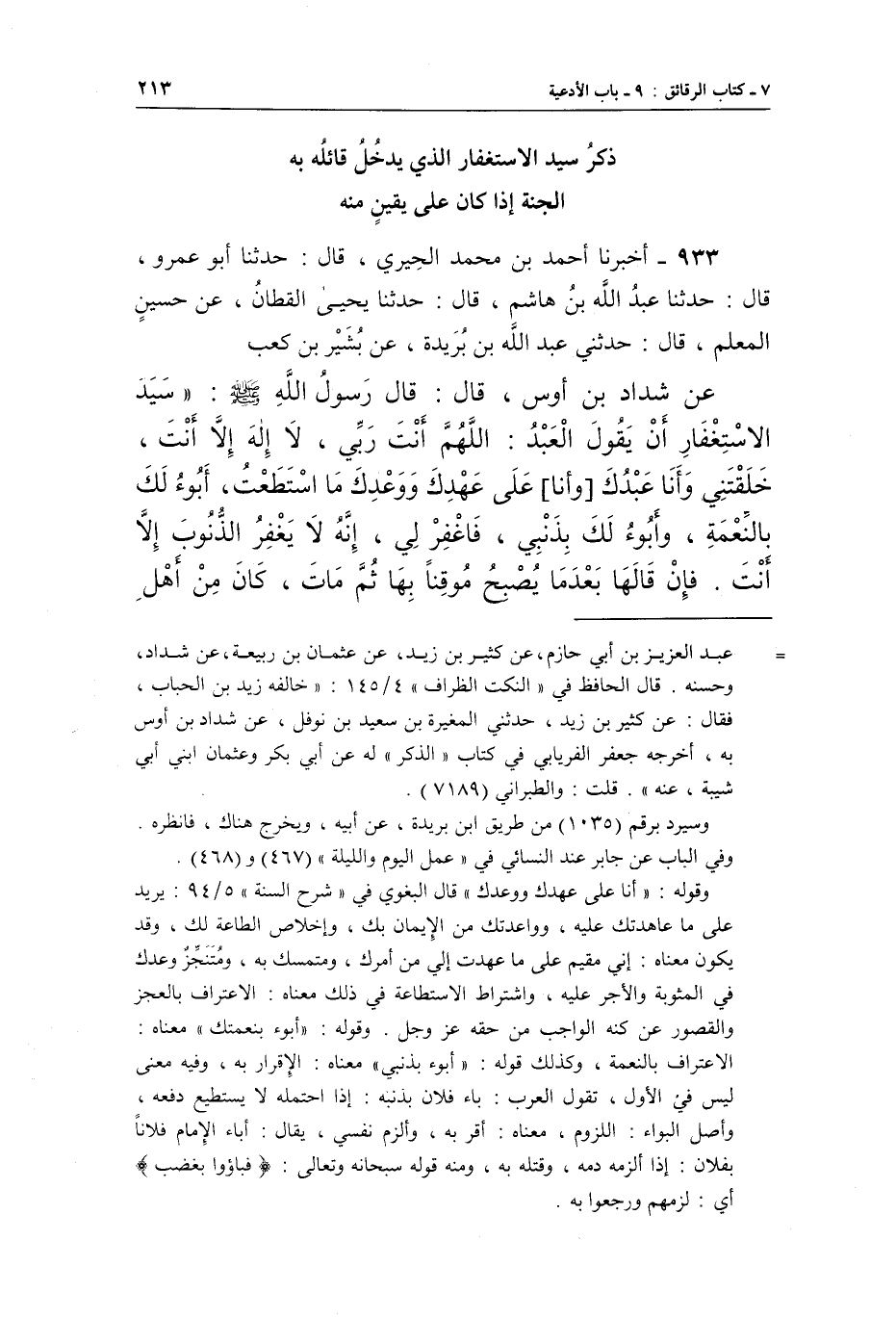 933 - أَخْبَرَنَا أَحْمَدُ بْنُ مُحَمَّدٍ الْحِيرِيُّ أَبُو عَمْرٍو، قَالَ: حَدَّثَنَا عَبْدُ اللَّهِ بْنُ هَاشِمٍ، قَالَ: حَدَّثَنَا يَحْيَى الْقَطَّانُ، عَنْ حُسَيْنٍ الْمُعَلِّمِ، قَالَ: حَدَّثَنِي عَبْدُ اللَّهِ بْنُ بُرَيْدَةَ، عَنْ بَشِيرِ بْنِ كَعْبٍ، عَنْ شَدَّادِ بْنِ أَوْسٍ، قَالَ: قَالَ رَسُولُ اللَّهِ صَلَّى اللَّهُ عَلَيْهِ وَسَلَّمَ: «سَيِّدُ الِاسْتِغْفَارِ أَنْ يَقُولَ الْعَبْدُ: اللَّهُمَّ أَنْتَ رَبِّي، لَا إِلَهَ إِلَّا أَنْتَ، خَلَقْتَنِي وَأَنَا عَبْدُكَ، [وَأَنَا] عَلَى عَهْدِكَ وَوَعْدِكَ مَا اسْتَطَعْتُ، أَبُوءُ لَكَ بِالنِّعْمَةِ، وَأَبُوءُ لَكَ بِذَنْبِي، فَاغْفِرْ لِي، إِنَّهُ لَا يَغْفِرُ الذُّنُوبَ إِلَّا أَنْتَ، فَإِن قَالَهَا بَعْدَمَا يُصْبِحُ مُوقِنًا بِهَا ثُمَّ مَاتَ، كَانَ مِنْ أَهْلِ