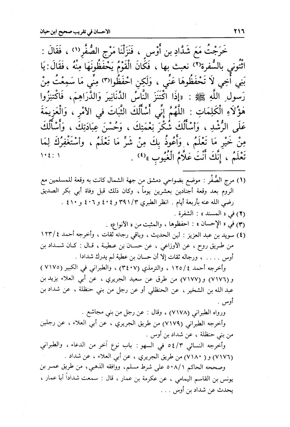 خَرَجْتُ مَعَ شَدَّادِ بْنِ أَوْسٍ، فَنَزَلْنَا مَرْجَ الصُّفَّرِ (¬1) ، فَقَالَ: ائْتُونِي بِالسُّفْرَةِ (¬2) نَعْبَثْ بِهَا، فَكَانَ الْقَوْمُ يَحْفَظُونَهَا مِنْهُ، فَقَالَ: يَا بَنِي أَخِي، لَا تَحْفَظُوهَا عَنِّي، وَلَكِنِ احْفَظُوا (¬3) مِنِّي مَا سَمِعْتُ مِنْ رَسُولِ اللَّهِ صَلَّى اللَّهُ عَلَيْهِ وَسَلَّمَ: «إِذَا اكْتَنَزَ النَّاسُ الدَّنَانِيرَ وَالدَّرَاهِمَ، فَاكْتَنِزُوا هَؤُلَاءِ الْكَلِمَاتَ: اللَّهُمَّ إِنِّي أَسْأَلُكَ الثَّبَاتَ فِي الْأَمْرِ، وَالْعَزِيمَةَ عَلَى الرُّشْدِ، وَأَسْأَلُكَ شُكْرَ نِعْمَتِكَ، وَحُسْنَ عِبَادَتِكَ، وَأَسْأَلُكَ مِنْ خَيْرِ مَا تَعْلَمُ، وَأَعُوذُ بِكَ مِنْ شَرِّ مَا تَعْلَمُ، وَأَسْتَغْفِرُكَ لِمَا تَعْلَمُ، إِنَّكَ أَنْتَ عَلَّامُ الْغُيُوبِ» (¬4) . [1: 104]
