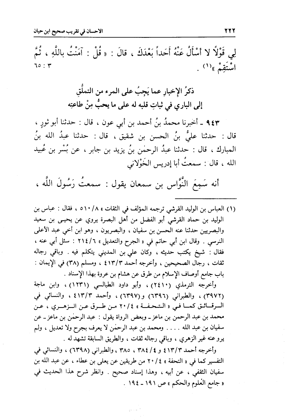 (¬1) العباس بن الوليد القرشي ترجمه المؤلف في الثقات " 8/510، فقال: عباس بن الوليد بن حماد القرشي أبو الفضل من أهل البصرة يروي عن يحيى بن سعيد والبصريين حدثنا عنه الحسن بن سفيان، والبصريون، وهو ابن أخي عبد الأعلى النرسي. وقال ابن أبي حاتم في "الجرح والتعديل" 6/214: سئل أبي عنه، فقال: شيخ يكتب حديثه، وكان علي بن المديني يتكلم فيه. وباقي رجاله ثقات، رجال الصحيحين وأخرجه أحمد 3/413، ومسلم (38) في الايمان: باب جامع أوصاف الاسلام من طرق عن هشام بن عروة بهذا الإسناد.