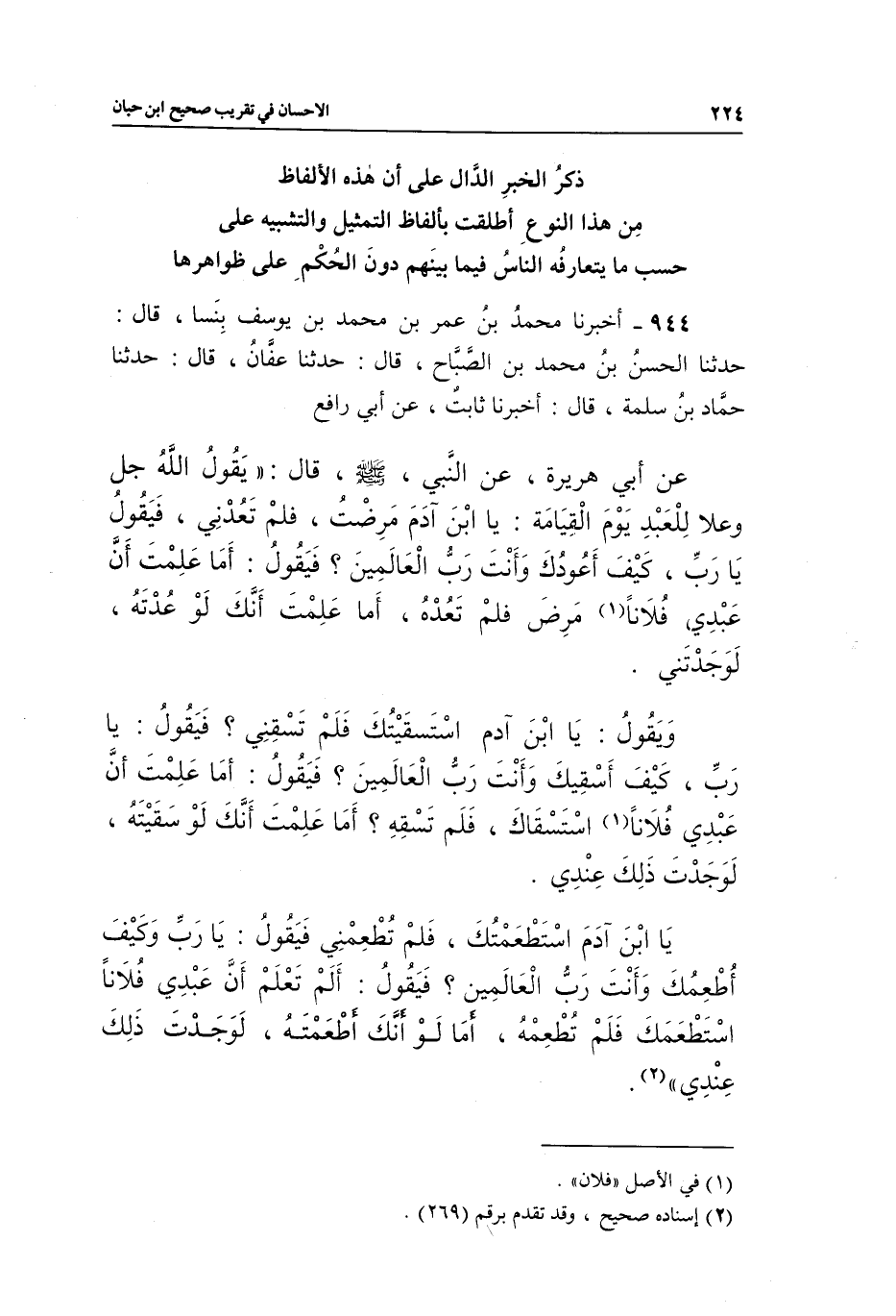 944 - أَخْبَرَنَا مُحَمَّدُ بْنُ عُمَرَ بْنِ مُحَمَّدِ بْنِ يُوسُفَ بِنَسَا، قَالَ: حَدَّثَنَا الْحَسَنُ بْنُ مُحَمَّدِ بْنِ الصَّبَّاحِ، قَالَ: حَدَّثَنَا عَفَّانُ، قَالَ: حَدَّثَنَا حَمَّادُ بْنُ سَلَمَةَ، قَالَ: أَخْبَرَنَا ثَابِتٌ، عَنْ أَبِي رَافِعٍ، عَنْ أَبِي هُرَيْرَةَ، عَنِ النَّبِيِّ صَلَّى اللَّهُ عَلَيْهِ وَسَلَّمَ، قَالَ: «يَقُولُ اللَّهُ جَلَّ وَعَلَا لِلْعَبْدِ يَوْمَ الْقِيَامَةِ: يَا ابْنَ آدَمَ، مَرِضْتُ فَلَمْ تَعُدْنِي، فَيَقُولُ: يَا رَبِّ، كَيْفَ أَعُودُكَ وَأَنْتَ رَبُّ الْعَالَمِينَ؟ فَيَقُولُ: أَمَا عَلِمْتَ أَنَّ عَبْدِي فُلَانًا مَرِضَ فَلَمْ تَعُدْهُ، أَمَا عَلِمْتَ أَنَّكَ لَوْ عُدْتَهُ لَوَجَدْتَنِي.
