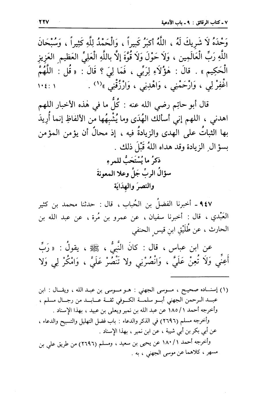 947 - أَخْبَرَنَا الْفَضْلُ بْنُ الْحُبَابِ، قَالَ: حَدَّثَنَا مُحَمَّدُ بْنُ كَثِيرٍ الْعَبْدِيُّ، قَالَ: أَخْبَرَنَا سُفْيَانُ، عَنْ عَمْرِو بْنِ مُرَّةَ، عَنْ عَبْدِ اللَّهِ بْنِ الْحَارِثِ، عَنْ طَلِيقِ بْنِ قَيْسٍ الْحَنَفِيِّ، عَنِ ابْنِ عَبَّاسٍ، قَالَ: كَانَ النَّبِيُّ صَلَّى اللَّهُ عَلَيْهِ وَسَلَّمَ، يَقُولُ: «رَبِّ أَعِنِّي وَلَا تُعِنْ عَلَيَّ، وَانْصُرْنِي وَلَا تَنَصُرْ عَلَيَّ، وَامْكُرْ لِي، وَلَا