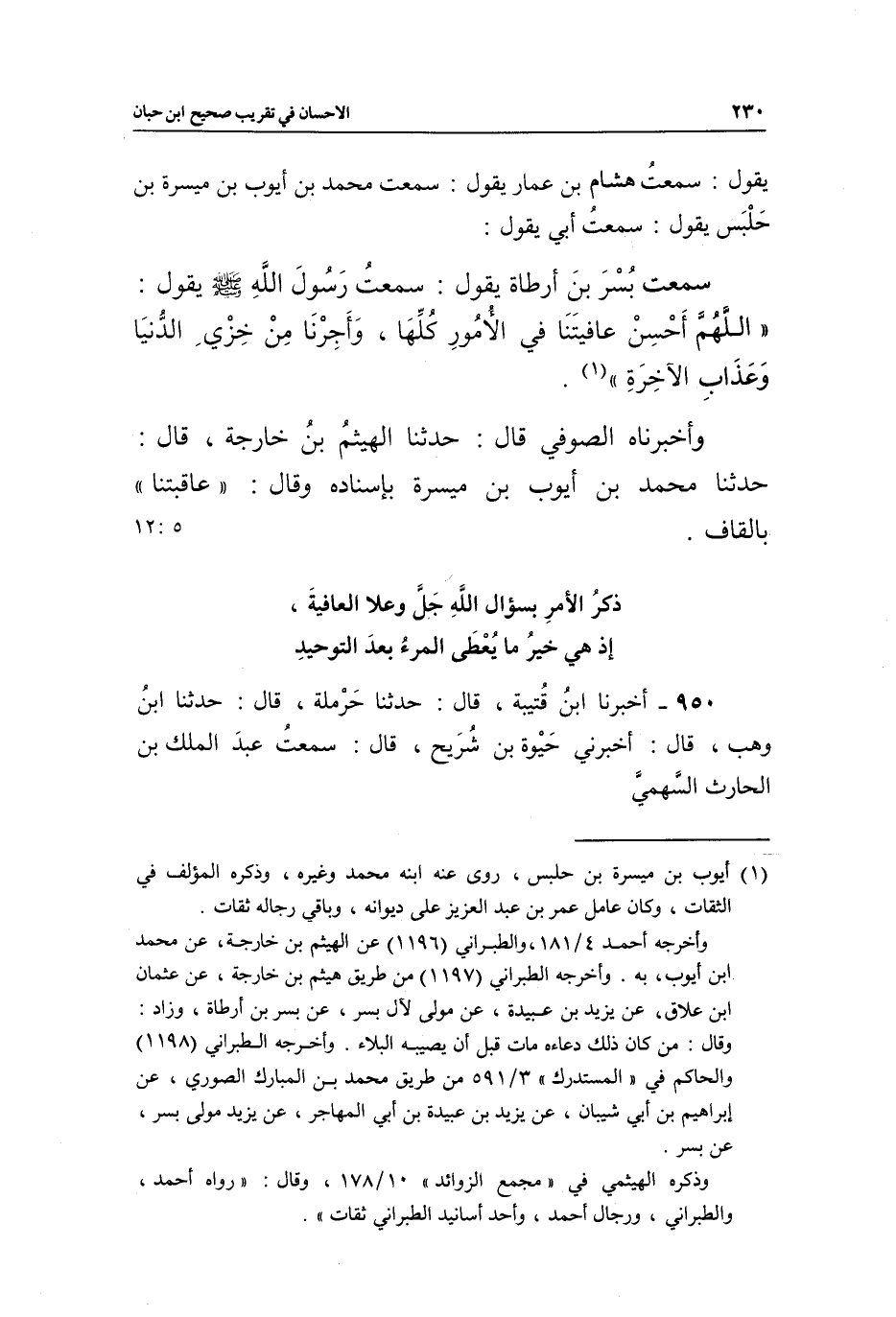 سَمِعْتُ بُسْرَ بْنَ أَرْطَاةَ، يَقُولُ: سَمِعْتُ رَسُولَ اللَّهِ صَلَّى اللَّهُ عَلَيْهِ وَسَلَّمَ، يَقُولُ: «اللَّهُمَّ أَحْسِنْ عَافِيَتَنَا فِي الْأُمُورِ كُلِّهَا، وَأَجِرْنَا مِنْ خِزْيِ الدُّنْيَا وَعَذَابِ الْآخِرَةِ» (¬1) .