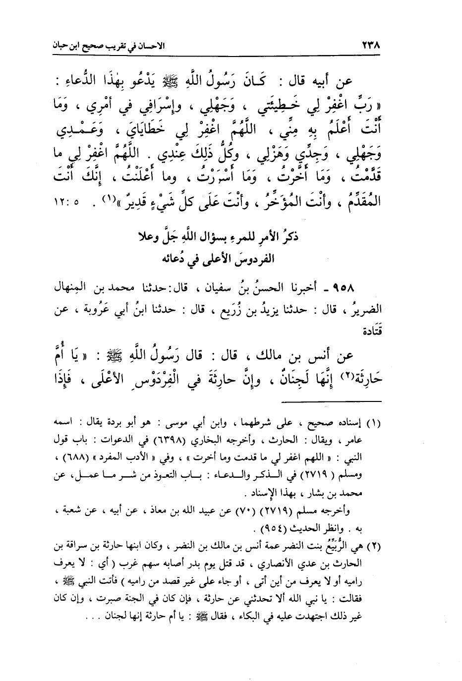 958 - أَخْبَرَنَا الْحَسَنُ بْنُ سُفْيَانَ، قَالَ: حَدَّثَنَا مُحَمَّدُ بْنُ الْمِنْهَالِ الضَّرِيرُ، قَالَ: حَدَّثَنَا يَزِيدُ بْنُ زُرَيْعٍ، قَالَ: حَدَّثَنَا ابْنُ أَبِي عَرُوبَةَ، عَنْ قَتَادَةَ، عَنْ أَنَسِ بْنِ مَالِكٍ، قَالَ:، قَالَ رَسُولُ اللَّهِ صَلَّى اللَّهُ عَلَيْهِ وَسَلَّمَ: «يَا أُمَّ حَارِثَةَ (¬2) إِنَّهَا لَجِنَانٌ، وَإِنَّ حَارِثَةَ فِي الْفِرْدَوْسِ الْأَعْلَى، فَإِذَا