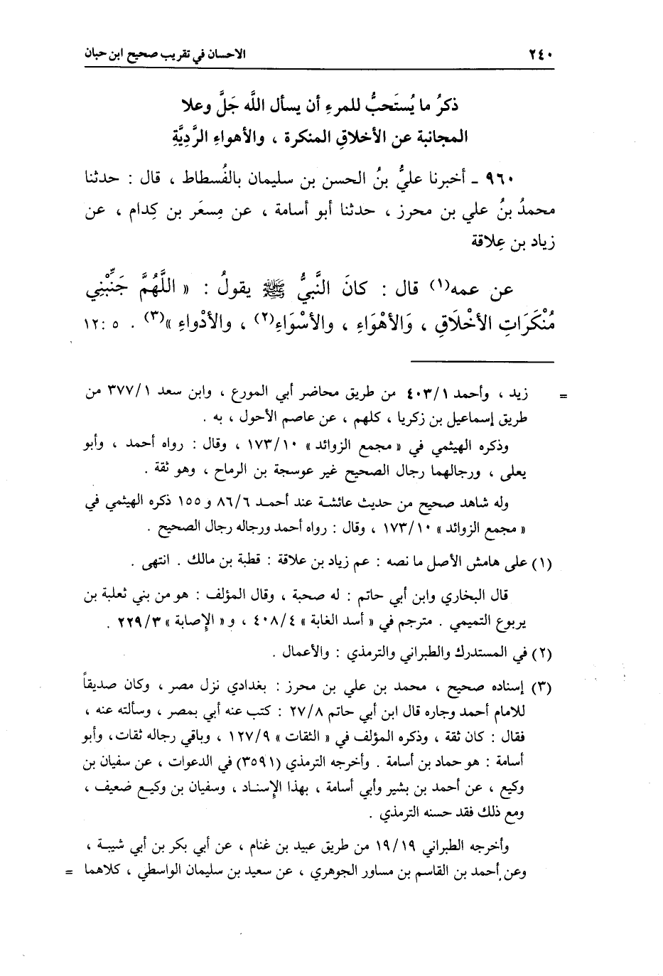 960 - أَخْبَرَنَا عَلِيُّ بْنُ الْحَسَنِ بْنِ سُلَيْمَانَ بِالْفُسْطَاطِ، قَالَ: حَدَّثَنَا مُحَمَّدُ بْنُ عَلِيِّ بْنِ مُحْرِزٍ، حَدَّثَنَا أَبُو أُسَامَةَ، عَنْ مِسْعَرِ بْنِ كِدَامٍ، عَنْ زِيَادِ بْنِ عِلَاقَةَ، عَنْ عَمِّهِ (¬1) قَالَ: كَانَ النَّبِيُّ صَلَّى اللَّهُ عَلَيْهِ وَسَلَّمَ، يَقُولُ: «اللَّهُمَّ جَنِّبْنِي مُنْكَرَاتِ الْأَخْلَاقِ، وَالْأَهْوَاءِ، وَالْأَسْوَاءِ (¬2) ، وَالْأَدْوَاءِ» (¬3) . [5: 12]