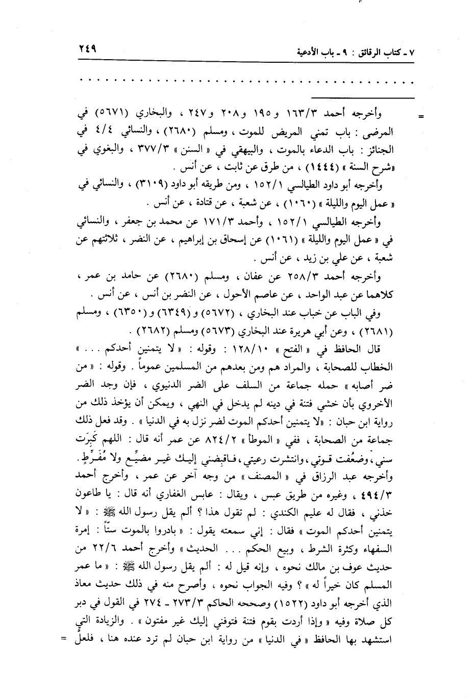 قال الحافظ في "الفتح" 10/128: وقوله: " لا يتمنين أحدكم ... " الخطاب للصحابة، والمراد هم ومن بعدهم من المسلمين عموماً. وقوله: "من ضر أصابه" حمله جماعة من السلف على الضر الدنيوي، فإن وجد الضر الأخروي بأن خشي فتنة في دينه لم يدخل في النهي، ويمكن أن يؤخذ ذلك من رواية ابن حبان. "لا يتمنين أحدكم الموت لضر نزل به في الدنيا" وقد فعل ذلك جماعة من الصحابة، ففي " الموطأ " 2/824 عن عمر أنه قال. "اللهم كَبِرَت سني، وضعُفت قوتي، وانتشرت رعيتي، فاقبِضني إليك غير مضيِّع ولا مُفَرِّطٍ.