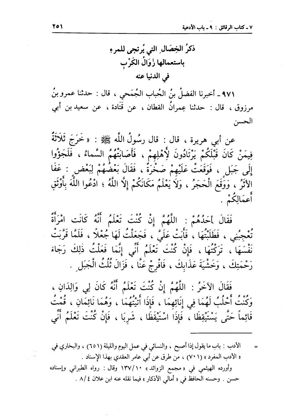 971 - أَخْبَرَنَا الْفَضْلُ بْنُ الْحُبَابِ الْجُمَحِيُّ، قَالَ: حَدَّثَنَا عَمْرُو بْنُ مَرْزُوقٍ، قَالَ: حَدَّثَنَا عِمْرَانُ الْقَطَّانُ، عَنْ قَتَادَةَ، عَنْ سَعِيدِ بْنِ أَبِي الْحَسَنِ، عَنْ أَبِي هُرَيْرَةَ، قَالَ: قَالَ رَسُولُ اللَّهِ صَلَّى اللَّهُ عَلَيْهِ وَسَلَّمَ: «خَرَجَ ثَلَاثَةٌ فِيمَنْ كَانَ قَبْلَكُمْ يَرْتَادُونَ لِأَهْلِهِمْ، فَأَصَابَتْهُمُ السَّمَاءُ، فَلَجَؤُوا إِلَى جَبَلٍ، فَوَقَعَتْ عَلَيْهِمْ صَخْرَةٌ، فَقَالَ بَعْضُهُمْ لِبَعْضٍ: عَفَا الْأَثَرُ، وَوَقَعَ الْحَجَرُ، وَلَا يَعْلَمُ مَكَانَكُمْ إِلَّا اللَّهُ، ادْعُوا اللَّهَ بِأَوْثَقِ أَعْمَالِكُمْ.