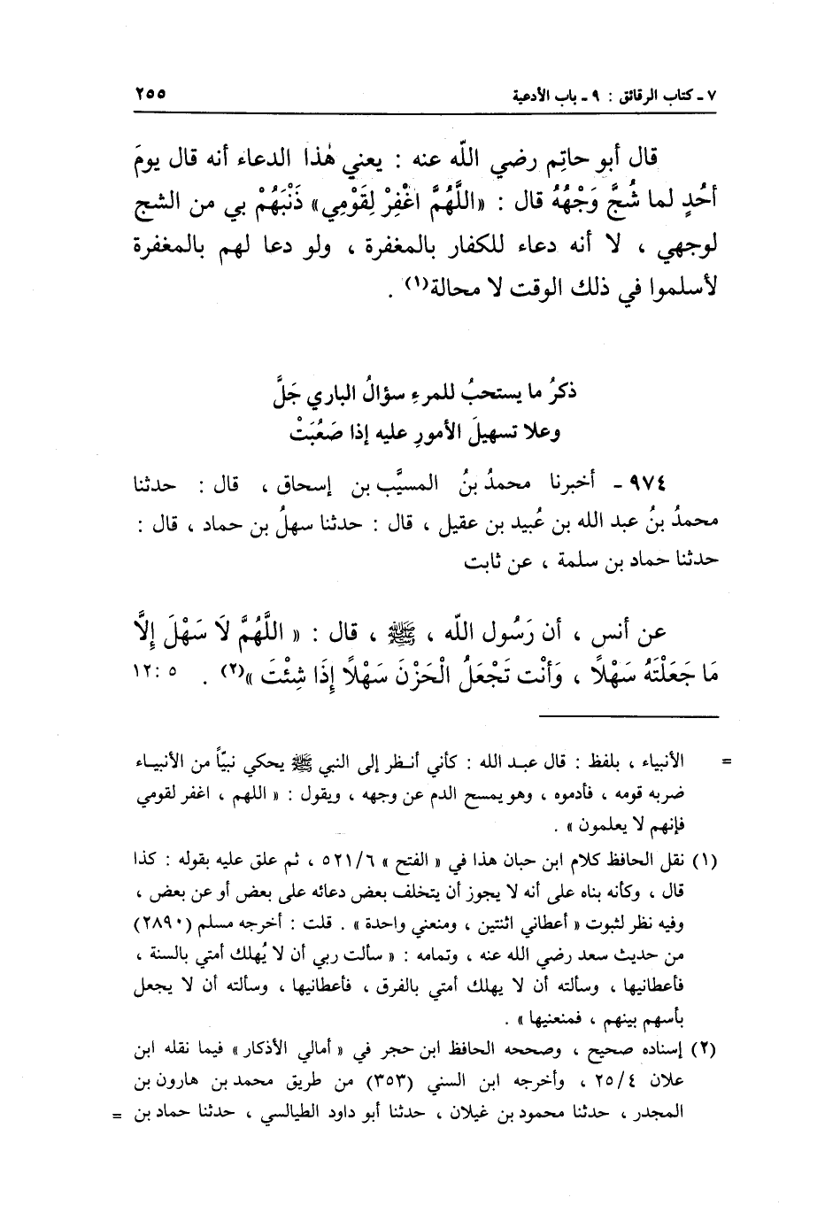 974 - أَخْبَرَنَا مُحَمَّدُ بْنُ الْمُسَيَّبِ بْنِ إِسْحَاقَ، قَالَ: حَدَّثَنَا مُحَمَّدُ بْنُ عَبْدِ اللَّهِ بْنِ عُبَيْدِ بْنِ عَقِيلٍ، قَالَ: حَدَّثَنَا سَهْلُ بْنُ حَمَّادٍ، قَالَ: حَدَّثَنَا حَمَّادُ بْنُ سَلَمَةَ، عَنْ ثَابِتٍ، عَنْ أَنَسٍ، أَنَّ رَسُولَ اللَّهِ صَلَّى اللَّهُ عَلَيْهِ وَسَلَّمَ، قَالَ: «اللَّهُمَّ لَا سَهْلَ إِلَّا مَا جَعَلْتَهُ سَهْلًا، وَأَنْتَ تَجْعَلُ الْحَزْنَ سَهْلًا إِذَا شِئْتَ» (¬2) . [5: 12]