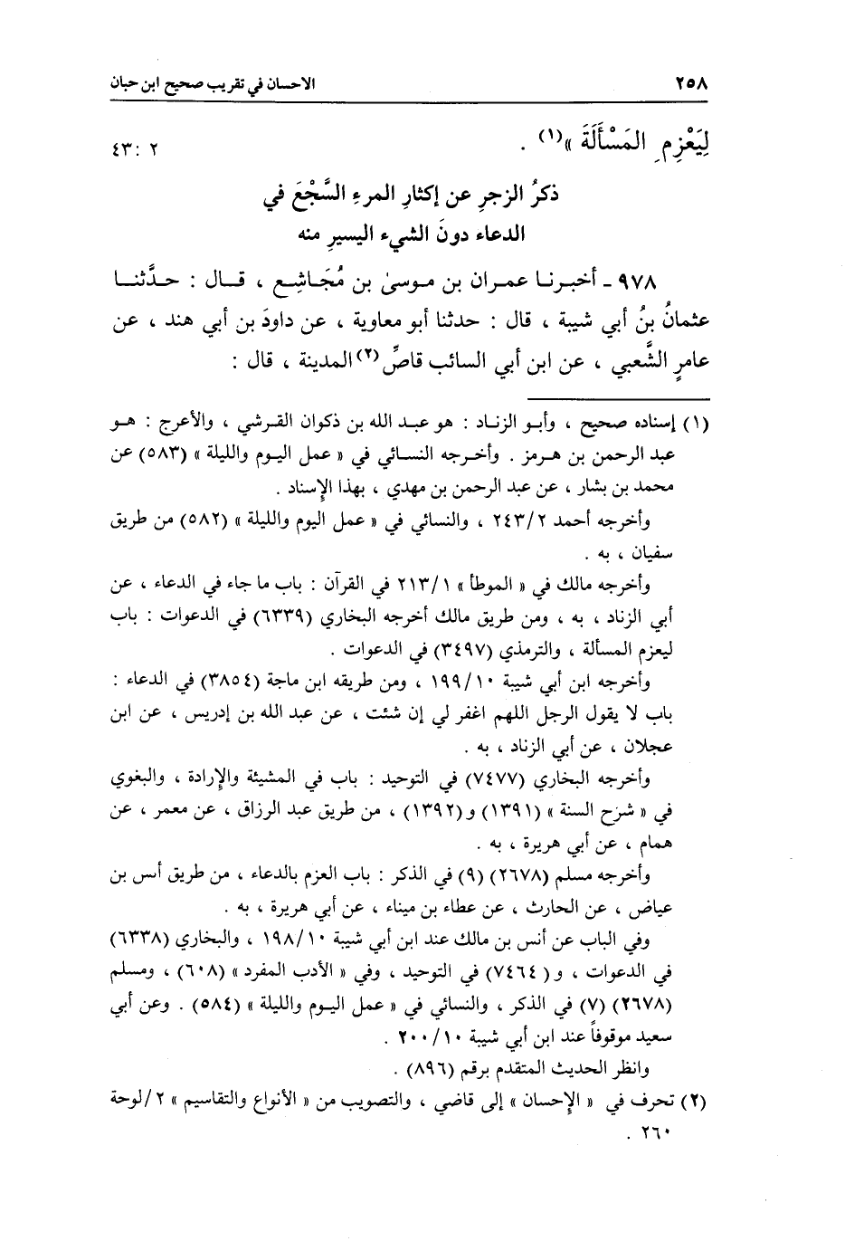 978 - أَخْبَرَنَا عِمْرَانُ بْنُ مُوسَى بْنِ مُجَاشِعٍ، قَالَ: حَدَّثَنَا عُثْمَانُ بْنُ أَبِي شَيْبَةَ، قَالَ: حَدَّثَنَا أَبُو مُعَاوِيَةَ، عَنْ دَاوُدَ بْنِ أَبِي هِنْدٍ، عَنْ عَامِرٍ الشَّعْبِيِّ، عَنِ ابْنِ أَبِي السَّائِبِ قَاصِّ (¬2) الْمَدِينَةِ، قَالَ: