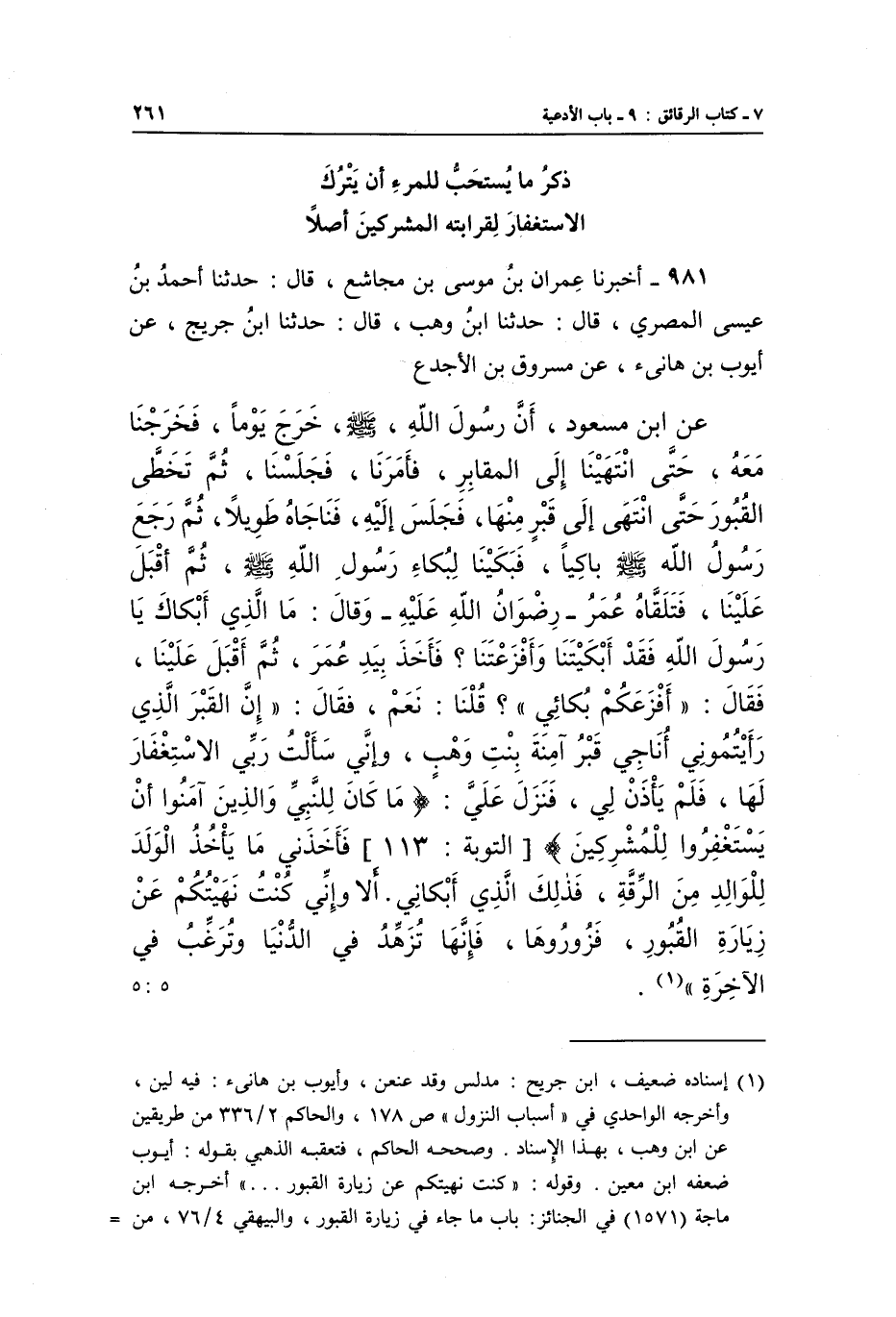 981 - أَخْبَرَنَا عِمْرَانُ بْنُ مُوسَى بْنِ مُجَاشِعٍ، قَالَ: حَدَّثَنَا أَحْمَدُ بْنُ عِيسَى الْمِصْرِيُّ، قَالَ: حَدَّثَنَا ابْنُ وَهْبٍ، قَالَ: حَدَّثَنَا ابْنُ جُرَيْجٍ، عَنْ أَيُّوبَ بْنِ هَانِئٍ، عَنْ مَسْرُوقِ بْنِ الْأَجْدَعِ، عَنِ ابْنِ مَسْعُودٍ، أَنَّ رَسُولَ اللَّهِ صَلَّى اللَّهُ عَلَيْهِ وَسَلَّمَ خَرَجَ يَوْمًا , فَخَرَجْنَا مَعَهُ، حَتَّى انْتَهَيْنَا إِلَى الْمَقَابِرِ، فَأَمَرَنَا فَجَلَسْنَا، ثُمَّ تَخَطَّى الْقُبُورَ حَتَّى انْتَهَى إِلَى قَبْرٍ مِنْهَا فَجَلَسَ إِلَيْهِ، فَنَاجَاهُ طَوِيلًا، ثُمَّ رَجَعَ رَسُولُ اللَّهِ صَلَّى اللَّهُ عَلَيْهِ وَسَلَّمَ بَاكِيًا، فَبَكَيْنَا لِبُكَاءِ رَسُولِ اللَّهِ صَلَّى اللَّهُ عَلَيْهِ وَسَلَّمَ، ثُمَّ أَقْبَلَ عَلَيْنَا، فَتَلَقَّاهُ عُمَرُ رِضْوَانُ اللَّهِ عَلَيْهِ وَقَالَ: مَا الَّذِي أَبْكَاكَ يَا رَسُولَ اللَّهِ , فَقَدْ أَبْكَيْتَنَا وَأَفْزَعْتَنَا؟ فَأَخَذَ بِيَدِ عُمَرَ، ثُمَّ أَقْبَلَ عَلَيْنَا، فَقَالَ: «أَفْزَعَكُمْ بُكَائِي؟» قُلْنَا: نَعَمْ , فَقَالَ: «إِنَّ الْقَبْرَ الَّذِي رَأَيْتُمُونِي أُنَاجِي قَبْرُ آمِنَةَ بِنْتِ وَهْبٍ، وَإِنِّي سَأَلْتُ رَبِّي الِاسْتِغْفَارَ لَهَا، فَلَمْ يَأْذَنْ لِي، فَنَزَلَ عَلَيَّ: {مَا كَانَ لِلنَّبِيِّ وَالَّذِينَ آمَنُوا أَنْ يَسْتَغْفِرُوا لِلْمُشْرِكِينَ} [التوبة: 113] , فَأَخَذَنِي مَا يَأْخُذُ الْوَلَدُ لِلْوَالِدِ مِنَ الرِّقَةِ، فَذَلِكَ الَّذِي أَبْكَانِي، أَلَا وَإِنِّي كُنْتُ نَهَيْتُكُمْ عَنْ زِيَارَةِ الْقُبُورِ، فَزُورُوهَا، فَإِنَّهَا تُزَهِّدُ فِي الدُّنْيَا وَتُرَغِّبُ فِي الْآخِرَةِ» (¬1) . [5: 5]