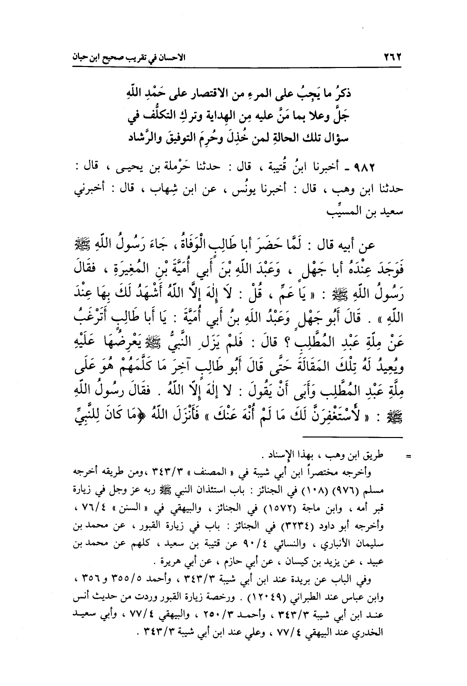 982 - أَخْبَرَنَا ابْنُ قُتَيْبَةَ، قَالَ: حَدَّثَنَا حَرْمَلَةُ بْنُ يَحْيَى، قَالَ: حَدَّثَنَا ابْنُ وَهْبٍ، قَالَ: أَخْبَرَنَا يُونُسُ، عَنِ ابْنِ شِهَابٍ، قَالَ: أَخْبَرَنِي سَعِيدُ بْنُ الْمُسَيَّبِ، عَنْ أَبِيهِ، قَالَ: لَمَّا حَضَرَ أَبَا طَالِبٍ الْوَفَاةُ جَاءَ رَسُولُ اللَّهِ صَلَّى اللَّهُ عَلَيْهِ وَسَلَّمَ فَوَجَدَ عِنْدَهُ أَبَا جَهْلٍ وَعَبْدَ اللَّهِ بْنَ أَبِي أُمَيَّةَ بْنِ الْمُغِيرَةِ، فَقَالَ رَسُولُ اللَّهِ صَلَّى اللَّهُ عَلَيْهِ وَسَلَّمَ: «يَا عَمِّ، قُلْ: لَا إِلَهَ إِلَّا اللَّهُ أَشْهَدْ لَكَ بِهَا عِنْدَ اللَّهِ» ، قَالَ أَبُو جَهْلٍ وَعَبْدُ اللَّهِ بْنُ أَبِي أُمَيَّةَ: يَا أَبَا طَالِبٍ أَتَرْغَبُ عَنْ مِلَّةِ عَبْدِ الْمُطَّلِبِ؟، قَالَ: فَلَمْ يَزَلِ النَّبِيُّ صَلَّى اللَّهُ عَلَيْهِ وَسَلَّمَ يَعْرِضُهَا عَلَيْهِ وَيُعِيدُ لَهُ تِلْكَ الْمَقَالَةَ حَتَّى قَالَ أَبُو طَالِبٍ آخِرَ مَا كَلَّمَهُمْ هُوَ عَلَى مِلَّةِ عَبْدِ الْمُطَّلِبِ وَأَبَى أَنْ يَقُولَ: لَا إِلَهَ إِلَّا اللَّهُ، فَقَالَ رَسُولُ اللَّهِ صَلَّى اللَّهُ عَلَيْهِ وَسَلَّمَ: «لَأَسْتَغْفِرَنَّ لَكَ مَا لَمْ أُنْهَ عَنْكَ» , فَأَنْزَلَ اللَّهُ: {مَا كَانَ لِلنَّبِيِّ