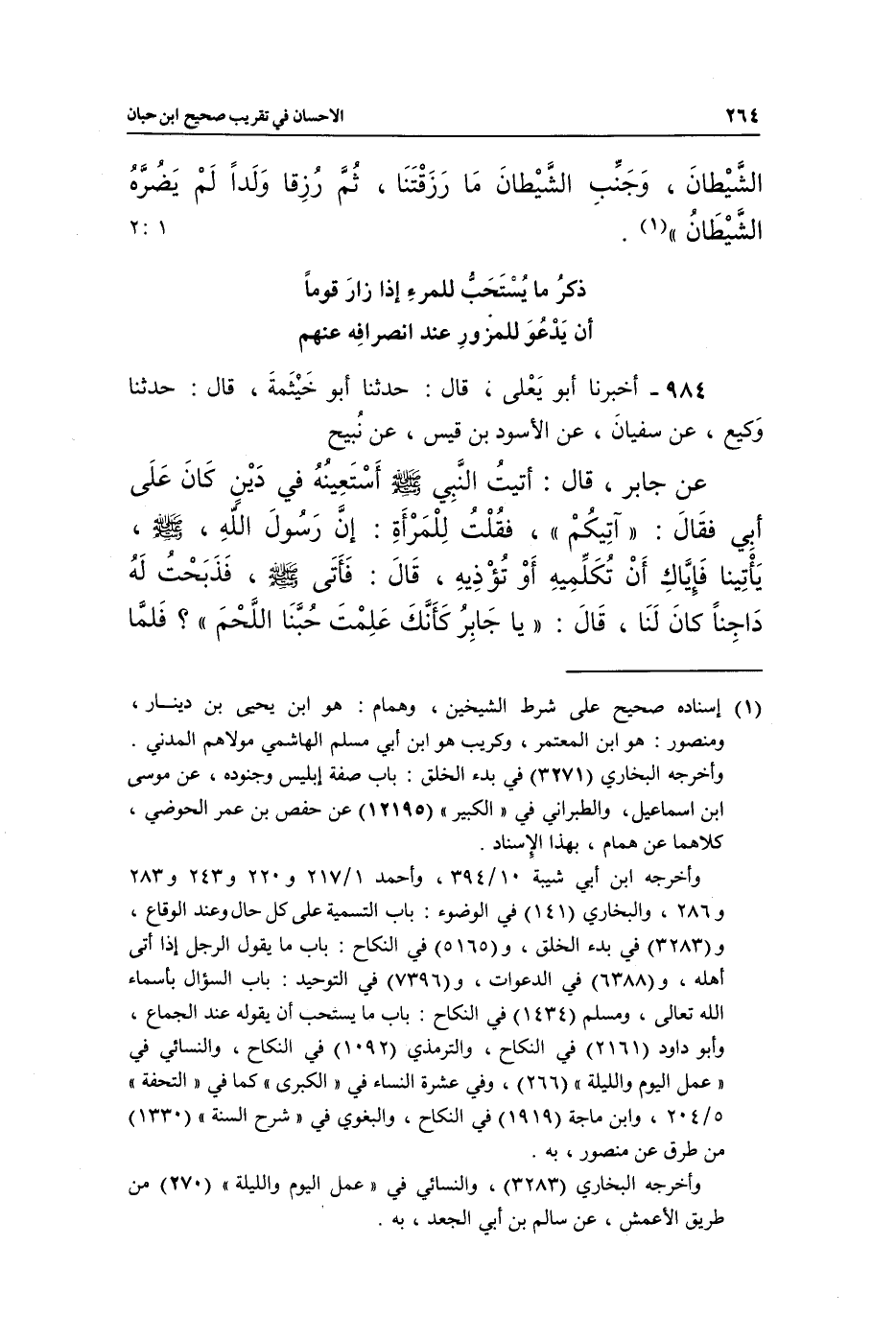 984 - أَخْبَرَنَا أَبُو يَعْلَى، قَالَ: حَدَّثَنَا أَبُو خَيْثَمَةَ، قَالَ: حَدَّثَنَا وَكِيعٌ، عَنْ سُفْيَانَ، عَنِ الْأَسْوَدِ بْنِ قَيْسٍ، عَنْ نُبَيْحٍ، عَنْ جَابِرٍ، قَالَ: أَتَيْتُ النَّبِيَّ صَلَّى اللَّهُ عَلَيْهِ وَسَلَّمَ أَسْتَعِينُهُ فِي دَيْنٍ كَانَ عَلَى أَبِي , فَقَالَ: «آتِيكُمْ» ، فَقُلْتُ لِلْمَرْأَةِ: إِنَّ رَسُولَ اللَّهِ صَلَّى اللَّهُ عَلَيْهِ وَسَلَّمَ يَأْتِينَا , فَإِيَّاكِ أَنْ تُكَلِّمِيهِ أَوْ تُؤْذِيهِ، قَالَ: فَأَتَى صَلَّى اللَّهُ عَلَيْهِ وَسَلَّمَ، فَذَبَحْتُ لَهُ دَاجِنًا كَانَ لَنَا، قَالَ: «يَا جَابِرُ كَأَنَّكَ عَلِمْتَ حُبَّنَا اللَّحْمَ؟» , فَلَمَّا