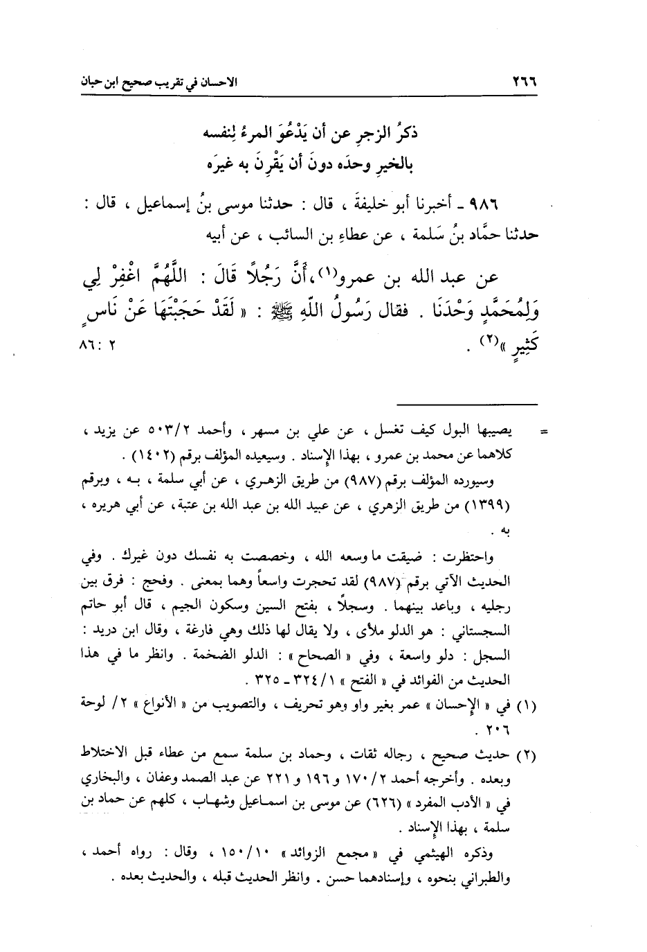 986 - أَخْبَرَنَا أَبُو خَلِيفَةَ، قَالَ: حَدَّثَنَا مُوسَى بْنُ إِسْمَاعِيلَ، قَالَ: حَدَّثَنَا حَمَّادُ بْنُ سَلَمَةَ، عَنْ عَطَاءِ بْنِ السَّائِبِ، عَنْ أَبِيهِ، عَنْ عَبْدِ اللَّهِ بْنِ عَمْرو (¬1) ، أَنَّ رَجُلًا، قَالَ: اللَّهُمَّ اغْفِرْ لِي وَلِمُحَمَّدٍ وَحْدَنَا. فَقَالَ رَسُولُ اللَّهِ صَلَّى اللَّهُ عَلَيْهِ وَسَلَّمَ: «لَقَدْ حَجَبْتَهَا عَنْ نَاسٍ كَثِيرٍ» (¬2) . [2: 86]