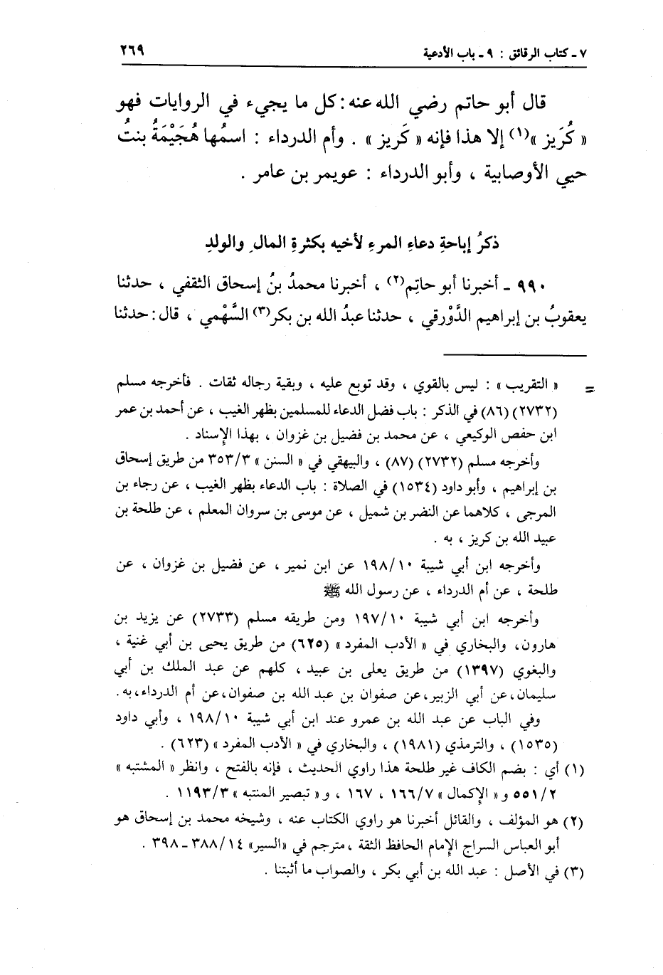 قَالَ أَبُو حَاتِمٍ رَضِيَ اللَّهُ عَنْهُ: كُلُّ مَا يَجِيءُ فِي الرِّوَايَاتِ فَهُوَ: «كُرَيْزٌ» (¬1) , إِلَّا هَذَا فَإِنَّهُ: «كَرِيزٌ» وَأُمُّ الدَّرْدَاءِ اسْمُهَا: هُجَيْمَةُ بِنْتُ حُيَيٍّ الْأَوْصَابِيَّةُ، وَأَبُو الدَّرْدَاءِ: عُوَيْمِرُ بْنُ عَامِرٍ.