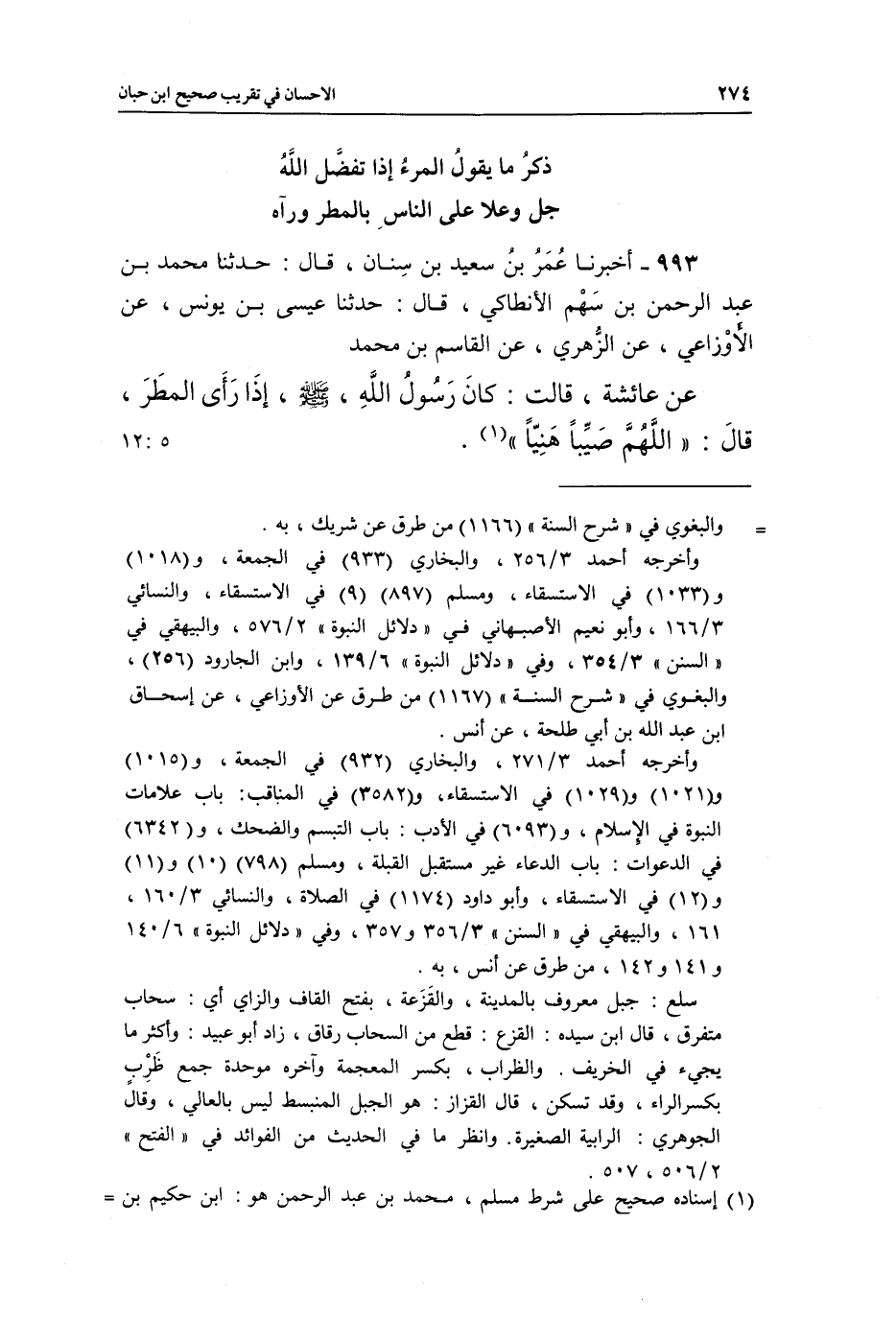993 - أَخْبَرَنَا عُمَرُ بْنُ سَعِيدِ بْنِ سِنَانٍ، قَالَ: حَدَّثَنَا مُحَمَّدُ بْنُ عَبْدِ الرَّحْمَنِ بْنِ سَهْمٍ الْأَنْطَاكِيُّ، قَالَ: حَدَّثَنَا عِيسَى بْنُ يُونُسَ، عَنِ الْأَوْزَاعِيِّ، عَنِ الزُّهْرِيِّ، عَنِ الْقَاسِمِ بْنِ مُحَمَّدٍ، عَنْ عَائِشَةَ، قَالَتْ: كَانَ رَسُولُ اللَّهِ صَلَّى اللَّهُ عَلَيْهِ وَسَلَّمَ إِذَا رَأَى الْمَطَرَ، قَالَ: «اللَّهُمَّ صَيِّبًا هَنِيًّا» (¬1) . [5: 12]