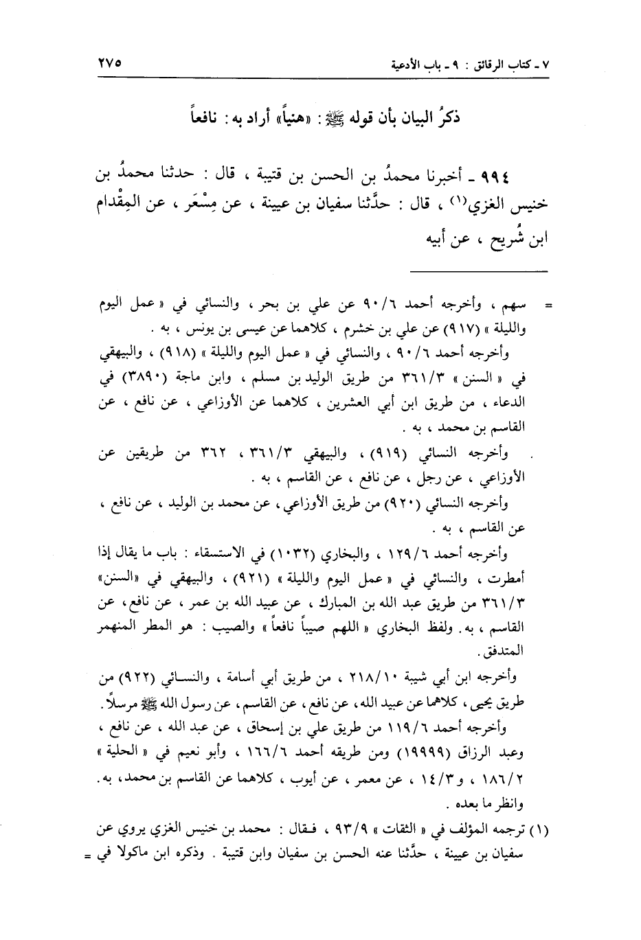 994 - أَخْبَرَنَا مُحَمَّدُ بْنُ الْحَسَنِ بْنِ قُتَيْبَةَ، قَالَ: حَدَّثَنَا مُحَمَّدُ بْنُ خُنَيْسٍ الْغَزِّيُّ (¬1) ، قَالَ: حَدَّثَنَا سُفْيَانُ بْنُ عُيَيْنَةَ، عَنْ مِسْعَرٍ، عَنِ الْمِقْدَامِ بْنِ شُرَيْحٍ، عَنْ أَبِيهِ،