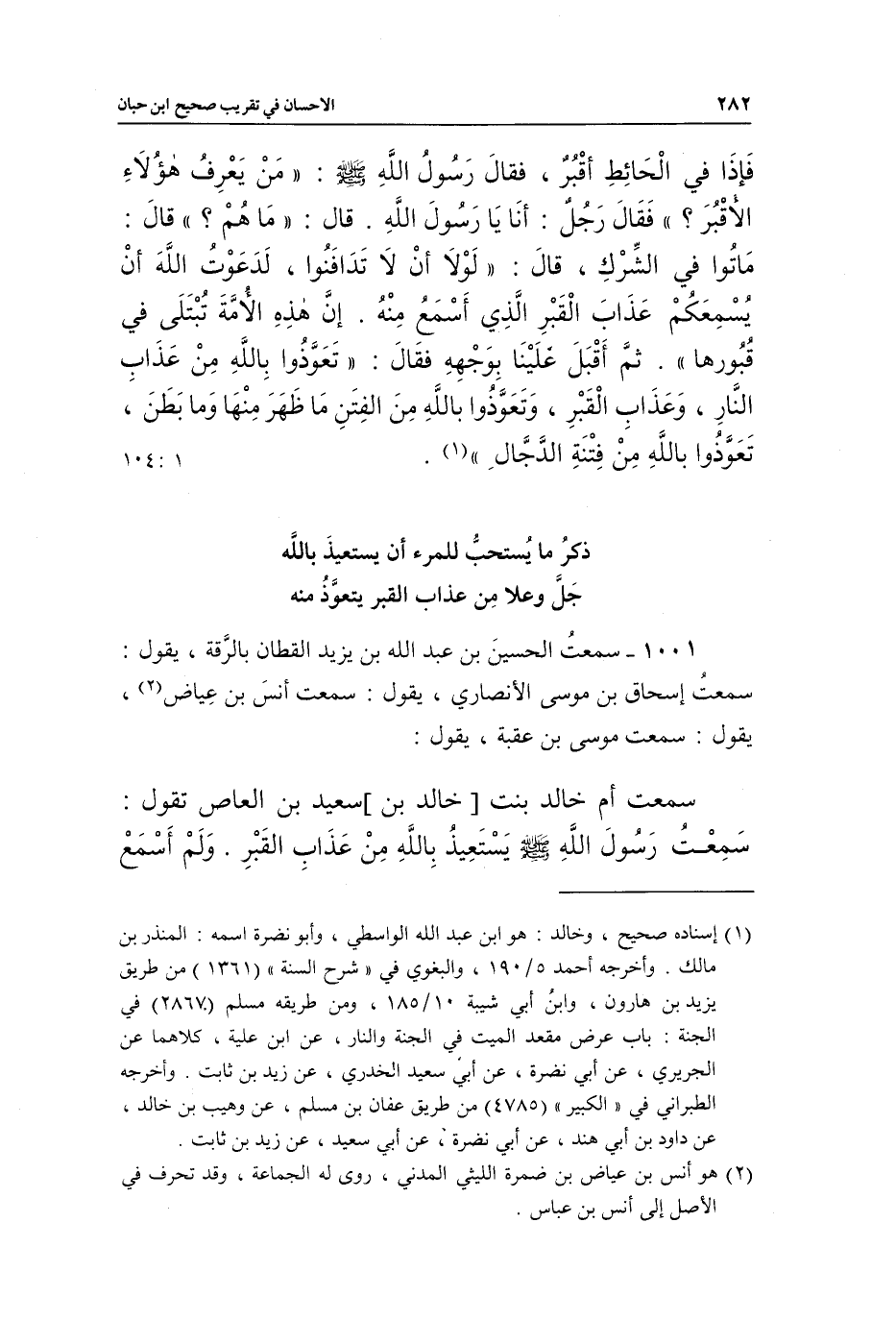 1001 - سَمِعْتُ الْحُسَيْنَ بْنَ عَبْدِ اللَّهِ بْنِ يَزِيدَ الْقَطَّانَ بِالرَّقَّةِ، يَقُولُ: سَمِعْتُ إِسْحَاقَ بْنَ مُوسَى الْأَنْصَارِيَّ، يَقُولُ: سَمِعْتُ أَنَسَ بْنَ عِيَاضٍ (¬2) ، يَقُولُ: سَمِعْتُ مُوسَى بْنَ عُقْبَةَ، يَقُولُ: سَمِعْتُ أُمَّ خَالِدٍ بِنْتَ [خَالِدِ بْنِ] سَعِيدِ بْنِ الْعَاصِ، تَقُولُ: «سَمِعْتُ رَسُولَ اللَّهِ صَلَّى اللَّهُ عَلَيْهِ وَسَلَّمَ يَسْتَعِيذُ بِاللَّهِ مِنْ عَذَابِ الْقَبْرِ» وَلَمْ أَسْمَعْ