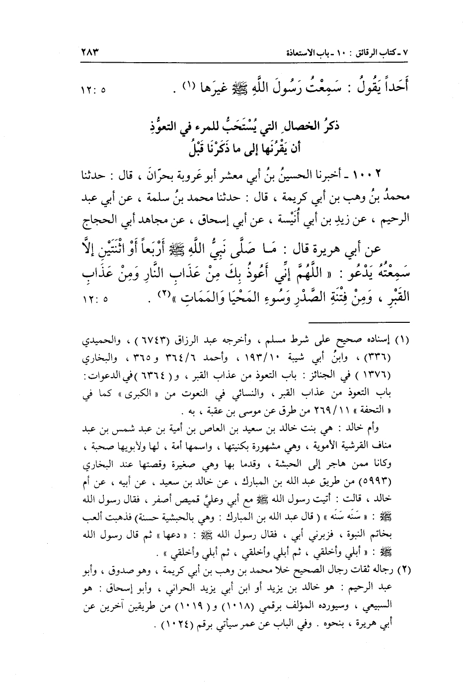 1002 - أَخْبَرَنَا الْحُسَيْنُ بْنُ أَبِي مَعْشَرٍ أَبُو عَرُوبَةَ بِحَرَّانَ، قَالَ: حَدَّثَنَا مُحَمَّدُ بْنُ وَهْبِ بْنِ أَبِي كَرِيمَةَ، قَالَ: حَدَّثَنَا مُحَمَّدُ بْنُ سَلَمَةَ، عَنْ أَبِي عَبْدِ الرَّحِيمِ، عَنْ زَيْدِ بْنِ أَبِي [أُنَيْسَةَ، عَنْ أَبِي] إِسْحَاقَ، عَنْ مُجَاهِدٍ أَبِي الْحَجَّاجِ، عَنْ أَبِي هُرَيْرَةَ، قَالَ: مَا صَلَّى نَبِيُّ اللَّهِ صَلَّى اللَّهُ عَلَيْهِ وَسَلَّمَ أَرْبَعًا أَوِ اثْنَتَيْنِ إِلَّا سَمِعْتُهُ يَدْعُو: «اللَّهُمَّ إِنِّي أَعُوذُ بِكَ مِنْ عَذَابِ النَّارِ , وَمِنْ عَذَابِ الْقَبْرِ، وَمِنْ فِتْنَةِ الصَّدْرِ وَسُوءِ الْمَحْيَا وَالْمَمَاتِ» (¬2) . [5: 12]