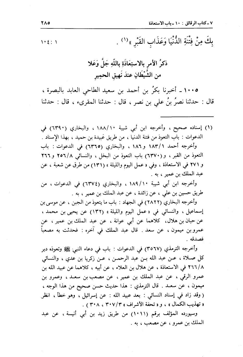 بِكَ مِنْ فِتْنَةِ الدُّنْيَا وَعَذَابِ الْقَبْرِ» (¬1) . [1: 104]