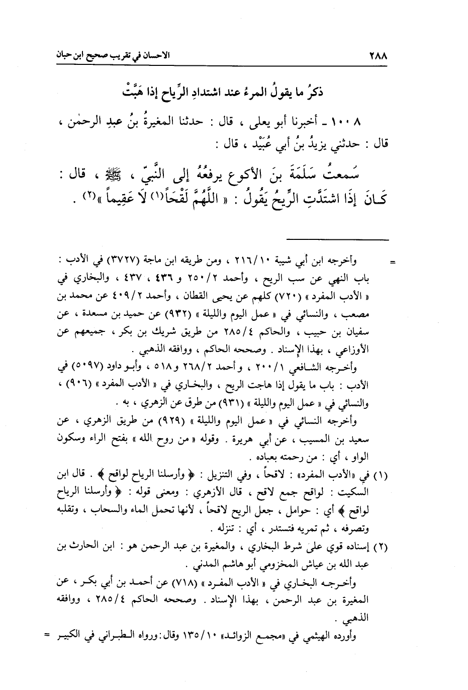 1008 - أَخْبَرَنَا أَبُو يَعْلَى، قَالَ: [حَدَّثَنَا أَحْمَدُ بْنُ عَبْدَةَ] ، حَدَّثَنَا الْمُغِيرَةُ بْنُ عَبْدِ الرَّحْمَنِ، قَالَ: حَدَّثَنِي يَزِيدُ بْنُ أَبِي عُبَيْدٍ، قَالَ: سَمِعْتُ سَلَمَةَ بْنَ الْأَكْوَعِ، يَرْفَعُهُ إِلَى النَّبِيِّ صَلَّى اللَّهُ عَلَيْهِ وَسَلَّمَ، قَالَ: كَانَ إِذَا اشْتَدَّتِ الرِّيحُ، يَقُولُ: «اللَّهُمَّ لَقْحًا (¬1) لَا عَقِيمًا» (¬2) .