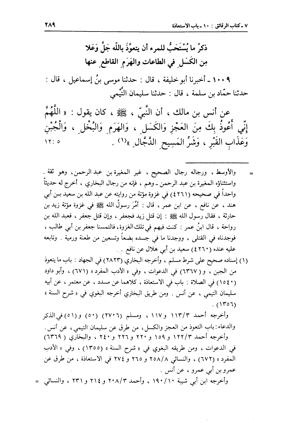 1009 - أَخْبَرَنَا أَبُو خَلِيفَةَ، قَالَ: حَدَّثَنَا مُوسَى بْنُ إِسْمَاعِيلَ، قَالَ: حَدَّثَنَا حَمَّادُ بْنُ سَلَمَةَ، قَالَ: حَدَّثَنَا سُلَيْمَانُ التَّيْمِيُّ، عَنْ أَنَسِ بْنِ مَالِكٍ، أَنَّ النَّبِيَّ صَلَّى اللَّهُ عَلَيْهِ وَسَلَّمَ كَانَ يَقُولُ: «اللَّهُمَّ إِنِّي أَعُوذُ بِكَ مِنَ الْعَجْزِ وَالْكَسَلِ، وَالْهَرَمِ وَالْبُخْلِ، وَالْجُبْنِ وَعَذَابِ الْقَبْرِ، وَشَرِّ الْمَسِيحِ الدَّجَّالِ» (¬1) . [5: 12]