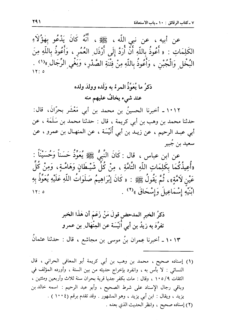 1012 - أَخْبَرَنَا الْحُسَيْنُ بْنُ مُحَمَّدِ بْنِ أَبِي مَعْشَرٍ بِحَرَّانَ، قَالَ: حَدَّثَنَا مُحَمَّدُ بْنُ وَهْبِ بْنِ أَبِي كَرِيمَةَ، قَالَ: حَدَّثَنَا مُحَمَّدُ بْنُ سَلَمَةَ، عَنْ أَبِي عَبْدِ الرَّحِيمِ، عَنْ زَيْدِ بْنِ أَبِي أُنَيْسَةَ، عَنِ الْمِنْهَالِ بْنِ عَمْرٍو، عَنْ سَعِيدِ بْنِ جُبَيْرٍ، عَنِ ابْنِ عَبَّاسٍ، قَالَ: كَانَ النَّبِيُّ صَلَّى اللَّهُ عَلَيْهِ وَسَلَّمَ يُعَوِّذُ حَسَنًا وَحُسَيْنًا: «أُعِيذُكُمَا بِكَلِمَاتِ اللَّهِ التَّامَّةِ مِنْ كُلِّ شَيْطَانٍ وَهَامَّةٍ، وَمِنْ كُلِّ عَيْنٍ لَامَّةٍ» , ثُمَّ يَقُولُ صَلَّى اللَّهُ عَلَيْهِ وَسَلَّمَ: «كَانَ إِبْرَاهِيمُ صَلَوَاتُ اللَّهِ عَلَيْهِ يُعَوِّذُ بِهِ ابْنَيْهِ إِسْمَاعِيلَ وَإِسْحَاقَ» (¬2) . [5: 12]