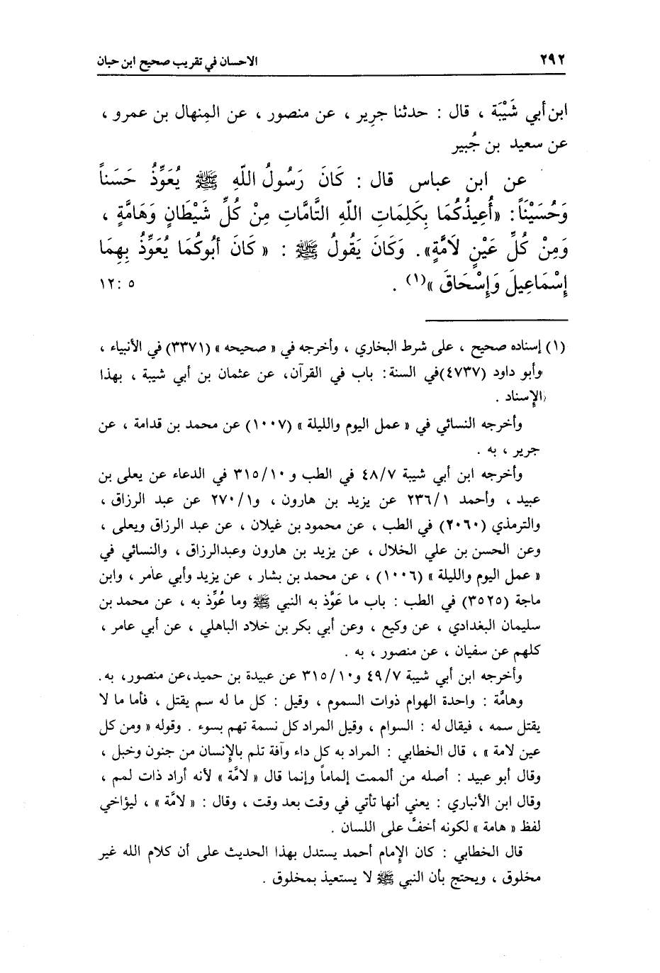 ابْنُ أَبِي شَيْبَةَ، قَالَ: حَدَّثَنَا جَرِيرٌ، عَنْ مَنْصُورٍ، عَنِ الْمِنْهَالِ بْنِ عَمْرٍو، عَنْ سَعِيدِ بْنِ جُبَيْرٍ، عَنِ ابْنِ عَبَّاسٍ، قَالَ: كَانَ رَسُولُ اللَّهِ صَلَّى اللَّهُ عَلَيْهِ وَسَلَّمَ يُعَوِّذُ حَسَنًا وَحُسَيْنًا: «أُعِيذُكُمَا بِكَلِمَاتِ اللَّهِ التَّامَّاتِ مِنْ كُلِّ شَيْطَانٍ وَهَامَّةٍ، وَمِنْ كُلِّ عَيْنٍ لَامَّةٍ» , وَكَانَ يَقُولُ صَلَّى اللَّهُ عَلَيْهِ وَسَلَّمَ: «كَانَ أَبُوكُمَا يُعَوِّذُ بِهِمَا إِسْمَاعِيلَ وَإِسْحَاقَ» (¬1) . [5: 12]