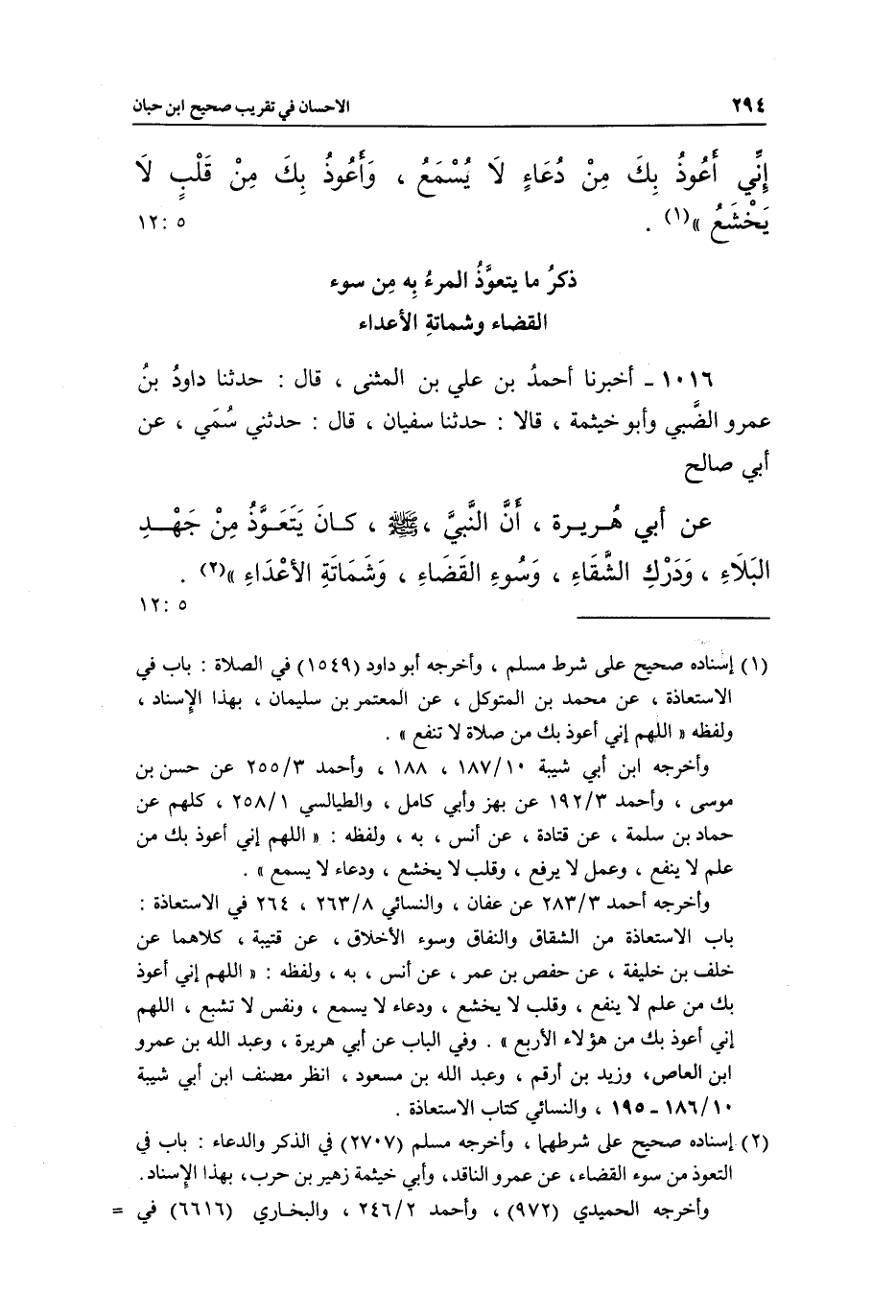 1016 - أَخْبَرَنَا أَحْمَدُ بْنُ عَلِيِّ بْنِ الْمُثَنَّى، قَالَ: حَدَّثَنَا دَاوُدُ بْنُ عَمْرٍو الضَّبِّيُّ، وَأَبُو خَيْثَمَةَ ,، قَالَا: حَدَّثَنَا سُفْيَانُ، قَالَ: حَدَّثَنِي سُمَيٌّ، عَنْ أَبِي صَالِحٍ، عَنْ أَبِي هُرَيْرَةَ، أَنَّ النَّبِيَّ صَلَّى اللَّهُ عَلَيْهِ وَسَلَّمَ «كَانَ يَتَعَوَّذُ مِنْ جَهْدِ الْبَلَاءِ، وَدَرْكِ الشَّقَاءِ، وَسُوءِ الْقَضَاءِ، وَشَمَاتَةِ الْأَعْدَاءِ» (¬2) [5: 12]