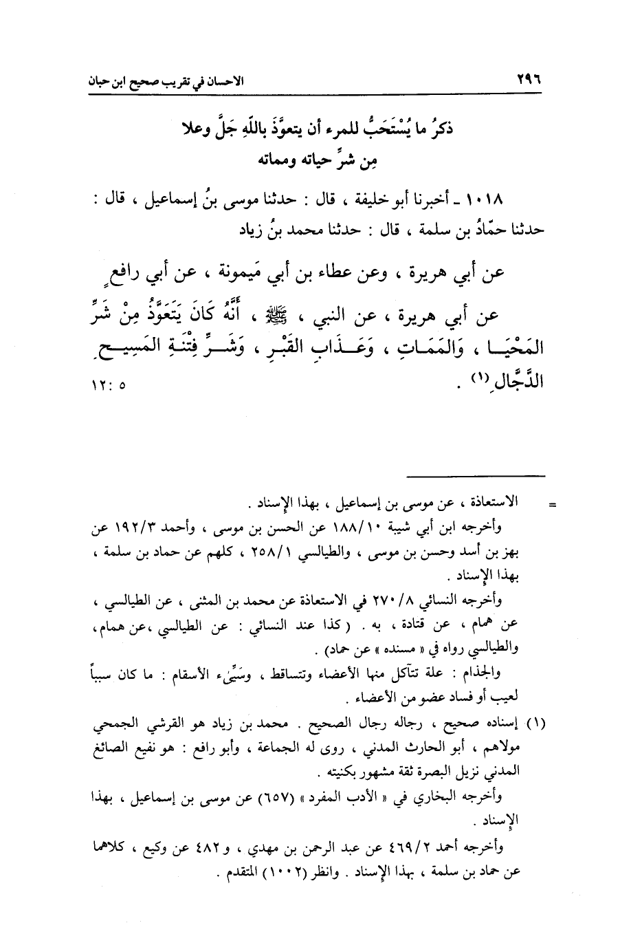 1018 - أَخْبَرَنَا أَبُو خَلِيفَةَ، قَالَ: حَدَّثَنَا مُوسَى بْنُ إِسْمَاعِيلَ، قَالَ: حَدَّثَنَا حَمَّادُ بْنُ سَلَمَةَ، قَالَ: حَدَّثَنَا مُحَمَّدُ بْنُ زِيَادٍ، عَنْ أَبِي هُرَيْرَةَ، وَعَنْ عَطَاءِ بْنِ أَبِي مَيْمُونَةَ، عَنْ أَبِي رَافِعٍ، عَنْ أَبِي هُرَيْرَةَ، عَنِ النَّبِيِّ صَلَّى اللَّهُ عَلَيْهِ وَسَلَّمَ , «أَنَّهُ كَانَ يَتَعَوَّذُ مِنْ شَرِّ الْمَحْيَا وَالْمَمَاتِ، وَعَذَابِ الْقَبْرِ، وَشَرِّ فِتْنَةِ الْمَسِيحِ الدَّجَّالِ» (¬1) . [5: 12]