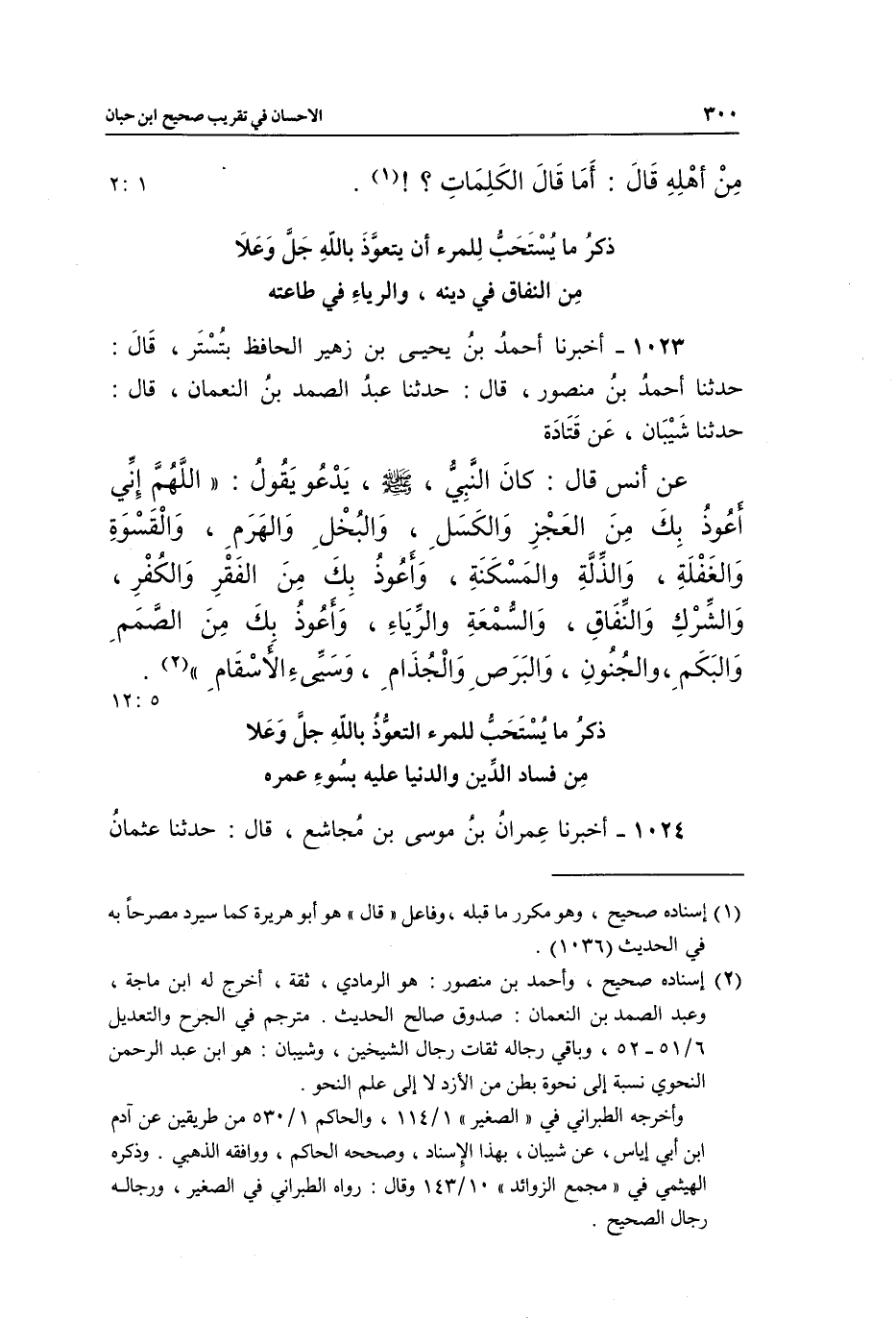 1023 - أَخْبَرَنَا أَحْمَدُ بْنُ يَحْيَى بْنِ زُهَيْرٍ الْحَافِظُ بِتُسْتَرَ، قَالَ: حَدَّثَنَا أَحْمَدُ بْنُ مَنْصُورٍ، قَالَ: حَدَّثَنَا عَبْدُ الصَّمَدِ بْنُ النُّعْمَانِ، قَالَ: حَدَّثَنَا شَيْبَانُ، عَنْ قَتَادَةَ، عَنْ أَنَسٍ، قَالَ: كَانَ النَّبِيُّ صَلَّى اللَّهُ عَلَيْهِ وَسَلَّمَ يَدْعُو، يَقُولُ: «اللَّهُمَّ إِنِّي أَعُوذُ بِكَ مِنَ الْعَجْزِ وَالْكَسَلِ، وَالْبُخْلِ وَالْهَرَمِ، وَالْقَسْوَةِ وَالْغَفْلَةِ، وَالذِّلَّةِ وَالْمَسْكَنَةِ، وَأَعُوذُ بِكَ مِنَ الْفَقْرِ وَالْكُفْرِ، وَالشِّرْكِ وَالنِّفَاقِ، وَالسُّمْعَةِ وَالرِّيَاءِ، وَأَعُوذُ بِكَ مِنَ الصَّمَمِ وَالْبَكَمِ، وَالْجُنُونِ، وَالْبَرَصِ وَالْجُذَامِ، وَسَيِّيءِ الْأَسْقَامِ» (¬2) . [5: 12]