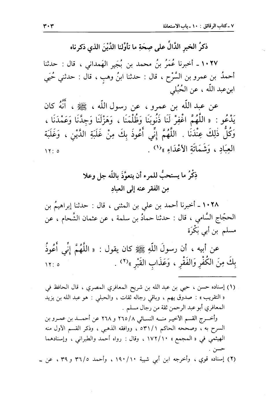 1028 - أَخْبَرَنَا أَحْمَدُ بْنُ عَلِيِّ بْنِ الْمُثَنَّى، قَالَ: حَدَّثَنَا إِبْرَاهِيمُ بْنُ الْحَجَّاجِ السَّامِيُّ، قَالَ: حَدَّثَنَا حَمَّادُ بْنُ سَلَمَةَ، عَنْ عُثْمَانَ الشَّحَّامِ، عَنْ مُسْلِمِ بْنِ أَبِي بَكْرَةَ، عَنْ أَبِيهِ، أَنَّ رَسُولَ اللَّهِ صَلَّى اللَّهُ عَلَيْهِ وَسَلَّمَ كَانَ يَقُولُ: «اللَّهُمَّ إِنِّي أَعُوذُ بِكَ مِنَ الْكُفْرِ وَالْفَقْرِ، وَعَذَابِ الْقَبْرِ» (¬2) . [5: 12]
