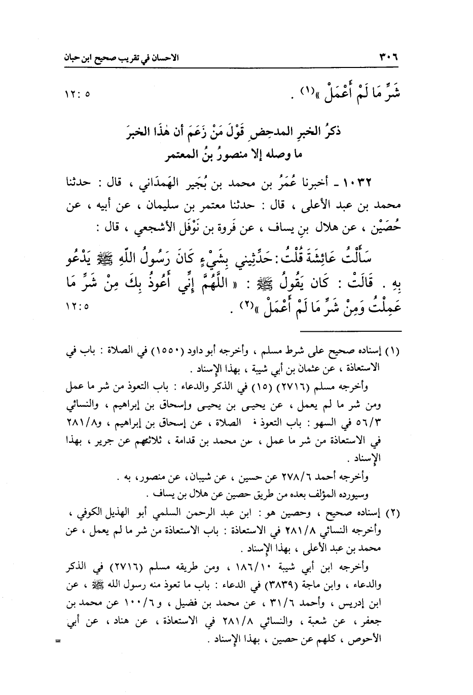 1032 - أَخْبَرَنَا عُمَرُ بْنُ مُحَمَّدِ بْنِ بُجَيْرٍ الْهَمْدَانِيُّ، قَالَ: حَدَّثَنَا مُحَمَّدُ بْنُ عَبْدِ الْأَعْلَى، قَالَ: حَدَّثَنَا مُعْتَمِرُ بْنُ سُلَيْمَانَ، عَنْ أَبِيهِ، عَنْ حُصَيْنٍ، عَنْ هِلَالِ بْنِ يَسَافٍ، عَنْ فَرْوَةَ بْنِ نَوْفَلٍ الْأَشْجَعِيِّ، قَالَ: سَأَلْتُ عَائِشَةَ، قُلْتُ: حَدِّثِينِي بِشَيْءٍ كَانَ رَسُولُ اللَّهِ صَلَّى اللَّهُ عَلَيْهِ وَسَلَّمَ يَدْعُو بِهِ , قَالَتْ: كَانَ يَقُولُ صَلَّى اللَّهُ عَلَيْهِ وَسَلَّمَ: «اللَّهُمَّ إِنِّي أَعُوذُ بِكَ مِنْ شَرِّ مَا عَمِلْتُ، وَمِنْ شَرِّ مَا لَمْ أَعْمَلْ» (¬2) . [5: 12]