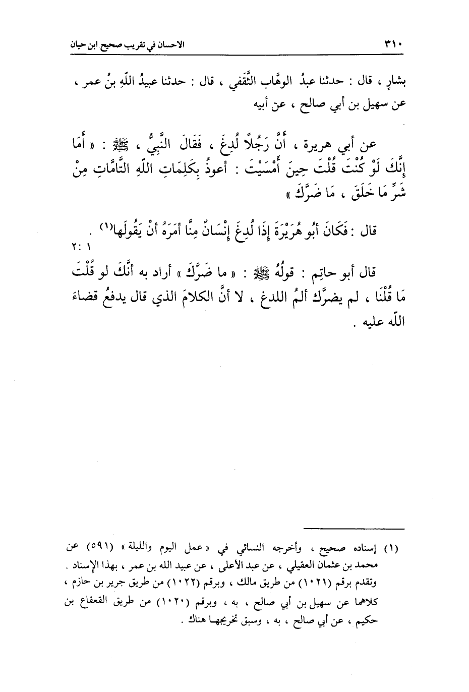قَالَ أَبُو حَاتِمٍ: قَوْلُهُ صَلَّى اللَّهُ عَلَيْهِ وَسَلَّمَ: «مَا ضَرَّكَ» أَرَادَ بِهِ أَنَّكَ لَوْ قُلْتَ مَا قُلْنَا، لَمْ يَضُرَّكَ أَلَمُ اللَّدْغِ، لَا أَنَّ الْكَلَامَ الَّذِي، قَالَ يَدْفَعُ قَضَاءَ اللَّهِ عَلَيْهِ