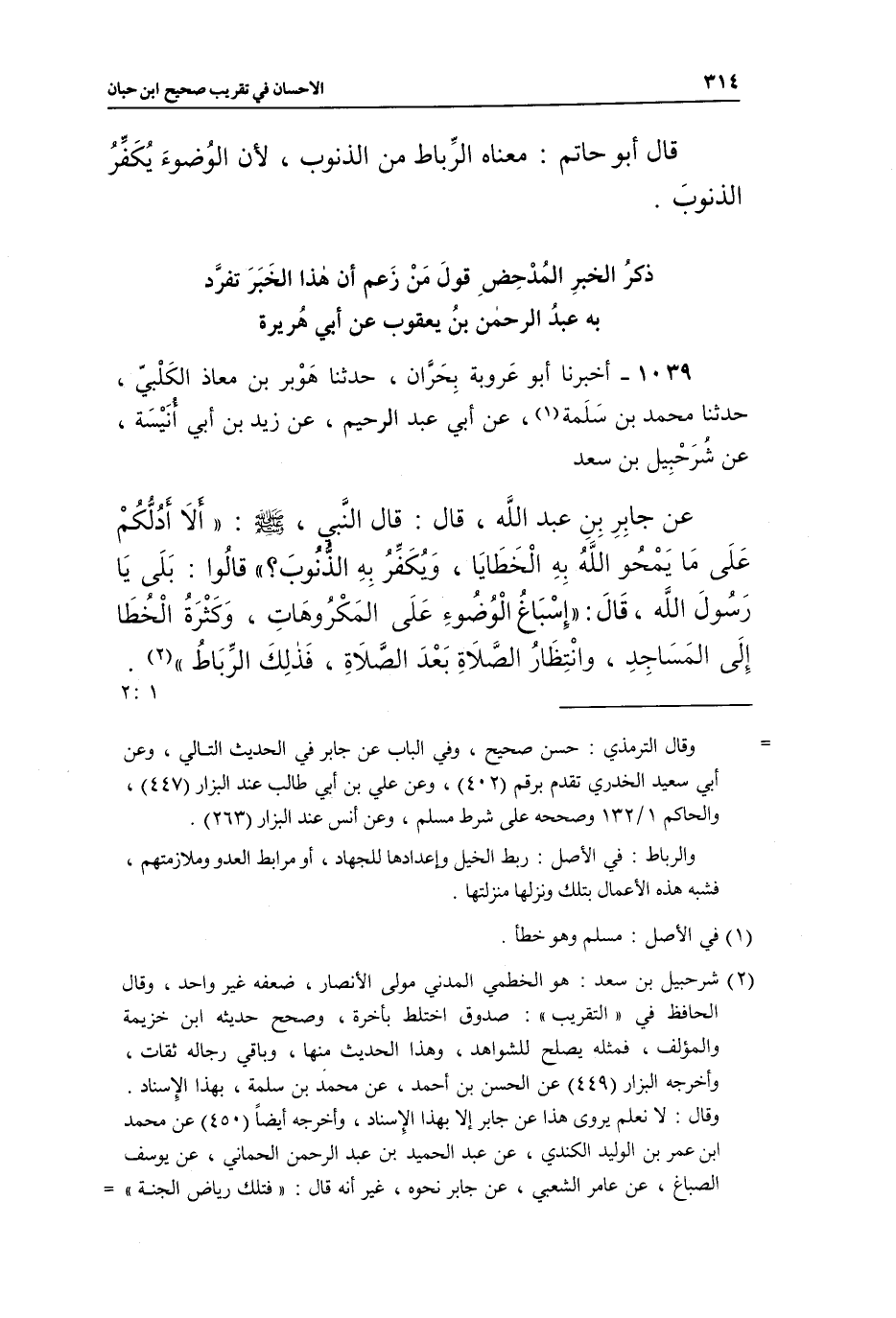 1039 - أَخْبَرَنَا أَبُو عَرُوبَةَ بِحَرَّانَ، حَدَّثَنَا هَوْبَرُ بْنُ مُعَاذٍ الْكَلْبِيُّ، حَدَّثَنَا مُحَمَّدُ بْنُ سَلَمَةَ1، عَنْ أَبِي عَبْدِ الرَّحِيمِ، عَنْ زَيْدِ بْنِ أَبِي أُنَيْسَةَ، عَنْ شرحبيل بْنِ سَعْدٍ عَنْ جَابِرِ بْنِ عَبْدِ اللَّهِ، قَالَ: قَالَ النَّبِيُّ، صَلَّى اللَّهُ عَلَيْهِ وَسَلَّمَ: "أَلَا أَدُلُّكُمْ عَلَى مَا يَمْحُو اللَّهُ بِهِ الْخَطَايَا، وَيُكَفَّرُ بِهِ الذُّنُوبَ؟ " قَالُوا: بَلَى يَا رَسُولَ اللَّهِ، قَالَ: "إِسْبَاغُ الْوُضُوءِ عَلَى الْمَكْرُوهَاتِ، وَكَثْرَةُ الْخُطَا إِلَى الْمَسَاجِدِ، وَانْتِظَارُ الصَّلَاةِ بَعْدَ الصلاة، فذلك الرباط" 2. 2:1