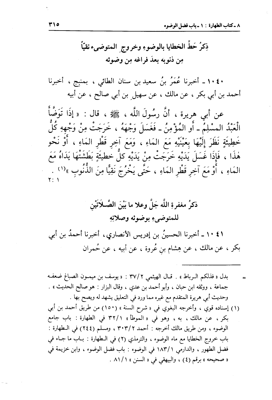 1040 - أَخْبَرَنَا عُمَرُ بْنُ سَعِيدِ بْنِ سِنَانٍ الطَّائِيُّ، بِمَنْبِجَ، أَخْبَرَنَا أَحْمَدُ بْنُ أَبِي بَكْرٍ، عَنْ مَالِكٍ، عَنْ سُهَيْلِ بْنِ أَبِي صَالِحٍ، عَنْ أَبِيهِ عَنْ أَبِي هُرَيْرَةَ، أَنَّ رَسُولَ اللَّهِ، صَلَّى اللَّهُ عَلَيْهِ وَسَلَّمَ، قَالَ: "إِذَا تَوَضَّأَ الْعَبْدُ الْمُسْلِمُ -أَوِ الْمُؤْمِنُ- فَغَسَلَ وَجْهَهُ، خَرَجَتْ مِنْ وَجْهِهِ كُلُّ خَطِيئَةٍ نَظَرَ إِلَيْهَا بِعَيْنَيْهِ مَعَ الْمَاءِ، وَمَعَ آخِرِ قَطْرِ الْمَاءِ، أَوْ نَحْوَ هَذَا، فَإِذَا غَسَلَ يَدَيْهِ خَرَجَتْ مِنْ يَدَيْهِ كُلُّ خَطِيئَةٍ بَطَشَتْهَا يَدَاهُ مَعَ الْمَاءِ، أَوْ مَعَ آخِرِ قَطْرِ الْمَاءِ، حَتَّى يَخْرُجَ نقيا من الذنوب" 1. 2:1
