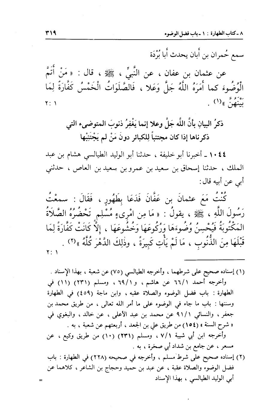1044 - أَخْبَرَنَا أَبُو خَلِيفَةَ، حَدَّثَنَا أَبُو الْوَلِيدِ الطَّيَالِسِيُّ هِشَامُ بْنُ عَبْدِ الْمَلِكِ، حَدَّثَنَا إِسْحَاقُ بْنُ سَعِيدِ بْنِ عَمْرِو بْنِ سَعِيدِ بْنِ الْعَاصِ حَدَّثَنِي أَبِي، عَنْ أَبِيهِ قَالَ: كُنْتُ مَعَ عُثْمَانَ بْنِ عَفَّانَ فَدَعَا بِطَهُورٍ، فَقَالَ: سَمِعْتُ رَسُولَ اللَّهِ، صَلَّى اللَّهُ عَلَيْهِ وَسَلَّمَ، يَقُولُ: "مَا مِنِ امْرِئٍ مُسْلِمٍ تَحْضُرُهُ الصَّلَاةُ الْمَكْتُوبَةُ فَيُحْسِنُ وُضُوءَهَا وَرُكُوعَهَا وَخُشُوعَهَا، إِلَّا كَانَتْ كَفَّارَةً لِمَا قَبْلَهَا مِنَ الذُّنُوبِ، مَا لَمْ يَأْتِ كَبِيرَةً، وَذَلِكَ الدَّهْرَ كُلَّهُ" 2. 2:1