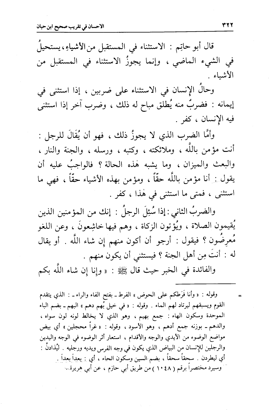 وَحَالُ الْإِنْسَانِ فِي الِاسْتِثْنَاءِ عَلَى ضَرْبَيْنِ، إِذَا اسْتَثْنَى فِي إِيمَانِهِ: فَضَرْبٌ مِنْهُ يُطْلَقُ مُبَاحٌ لَهُ ذَلِكَ، وَضَرْبٌ آخَرُ إِذَا اسْتَثْنَى فِيهِ الْإِنْسَانُ، كَفَرَ.