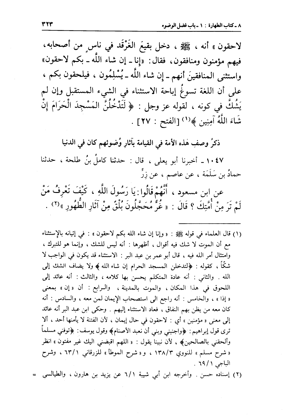 1047 - أَخْبَرَنَا أَبُو يَعْلَى، قَالَ: حَدَّثَنَا كَامِلُ بْنُ طَلْحَةَ، حَدَّثَنَا حَمَّادُ بْنُ سَلَمَةَ، عَنْ عَاصِمٍ، عَنْ زِرٍّ عَنِ بن مَسْعُودٍ، أَنَّهُمْ قَالُوا: يَا رَسُولَ اللَّهِ، كَيْفَ تَعْرِفُ مَنْ لَمْ تَرَ مِنْ أُمَّتِكَ؟ قَالَ: "غر محجلون بلق من آثار الطهور" 2.