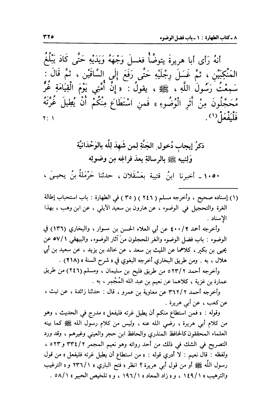 أَنَّهُ رَأَى أَبَا هُرَيْرَةَ يَتَوَضَّأُ فَغَسَلَ وَجْهَهُ وَيَدَيْهِ حَتَّى كَادَ يَبْلُغَ الْمَنْكِبَيْنِ، ثُمَّ غَسَلَ رِجْلَيْهِ حَتَّى رَفَعَ إِلَى السَّاقَيْنِ، ثُمَّ قَالَ: سَمِعْتُ رَسُولَ اللَّهِ، صَلَّى اللَّهُ عَلَيْهِ وسلم، يَقُولُ: " إِنَّ أُمَّتِي يَوْمَ الْقِيَامَةِ غُرٌّ مُحَجَّلُونَ مِنْ أَثَرِ الْوُضُوءِ" فَمَنِ اسْتَطَاعَ مِنْكُمْ أَنْ يطيل غرته فليفعل1. 2:1