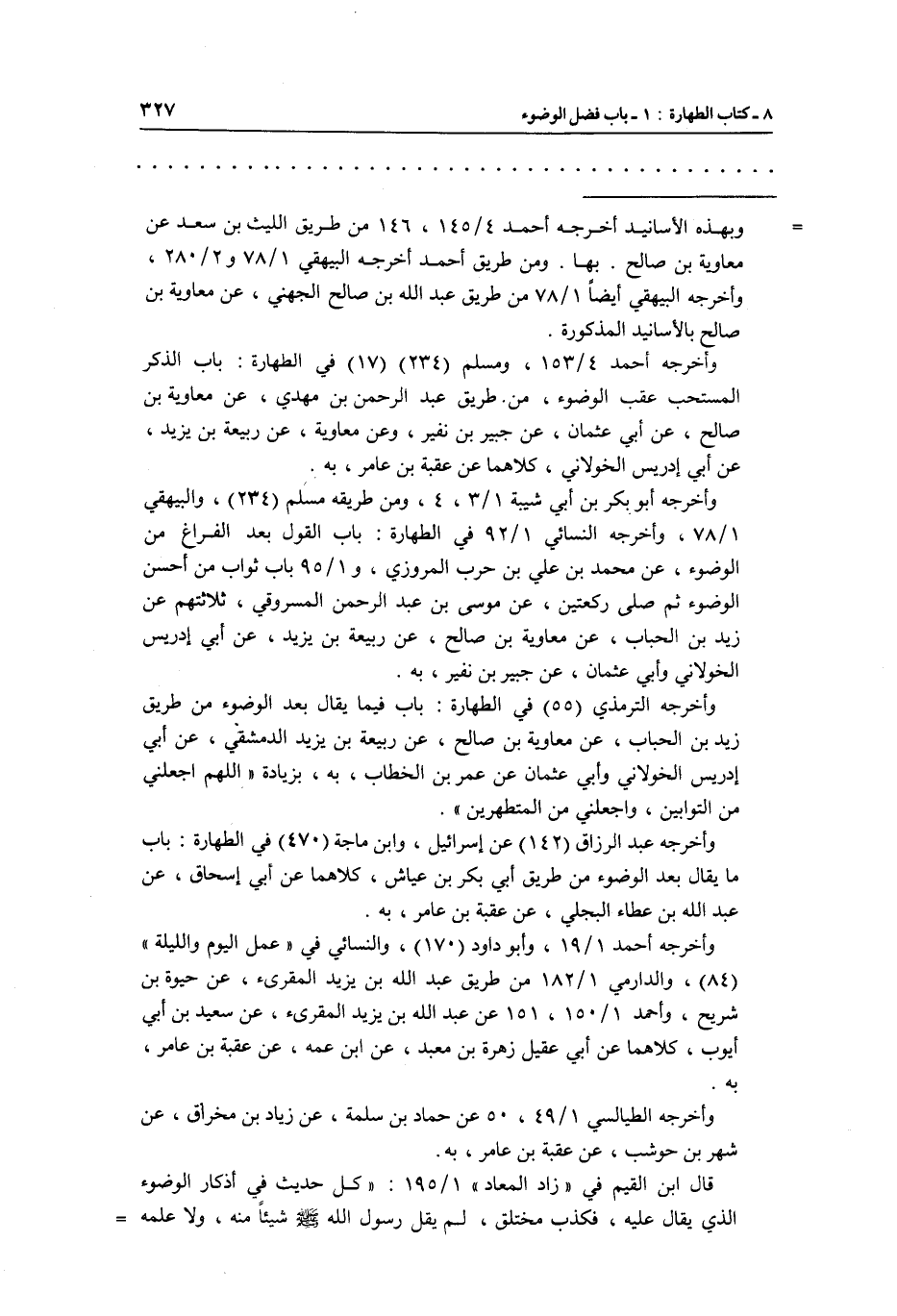 وأخرجه أبو بكر بن أبي شيبة 3/1، 4، ومن طريقه مسلم "234"، والبيهقي 1/78، وأخرجه النسائي 1/92 في الطهارة: باب القول بعد الفراغ من الوضوء، عن محمد بن علي بن حرب المروزي، و 1/95 باب ثواب من أحسن الوضوء ثم صلى ركعتين، عن موسى بن عبد الرحمن المسروقي، ثلاثتهم عن زيد بن الحباب، عن معاوية بن صالح، عن ربيعة بن يزيد، عن أبي إدريس الخولاني وأبي عثمان، عن جبير بن نفير، به.